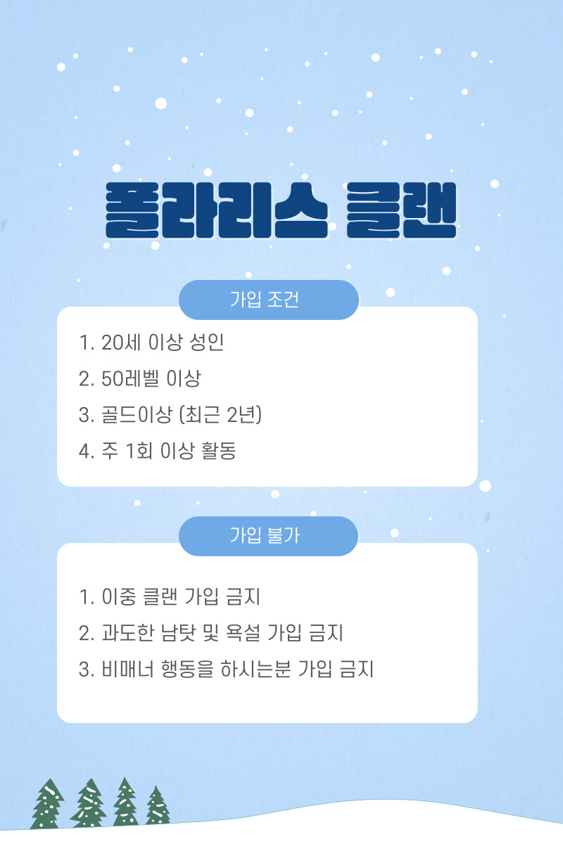 폴라리스 클랜은 랭크/자랭 위주의 클랜을 목표로 하고 있습니다.