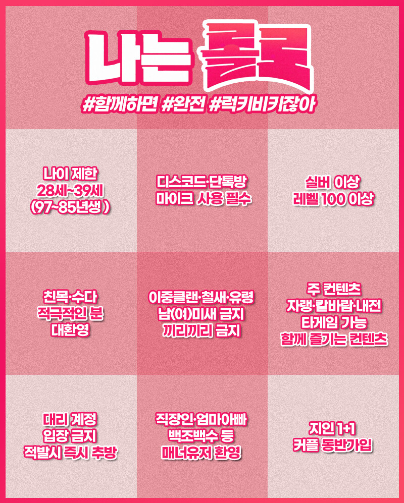 안녕하세요! 나는 LOLO <나는 롤로>입니다. 2024년 12월 6일에 만들어진 신생방으로 현재 인원은 34명입니다. 최대 정원은 50명으로 생각하고 있고, 자랭/내전주게임으로 하고 있습니다. 소수정예로 다양한 티어와 포지션별로 10명씩 받을 예정입니다. 주 티어대는 골드/에메랄드며, 주 게임 시간대는 평일 20시~24시/주말 상시입니다. 그렇다고 해서 아침, 새벽 유저가 없는 건 아니기 때문에 적극 문의 바랍니다. 탑 골드 이상 / 정글 플레티넘 이상 / 미드 플레티넘 이상 원딜은 마감입니다! / 서폿 실버 이상 게임을 재밌게 즐기되, 남에게 민폐주진 말자! 위 말을 모토로 오랫동안 함께할 매너있는 유저분들을 기다리고 있습니다. 친목도 다지면서 게임하실 적극적이고 활발하신 분은 언제나 환영하고 있으니, 많은 관심 부탁드립니다. ↓ 가입문의 ↓ https://open.kakao.com/o/gb61rI3g