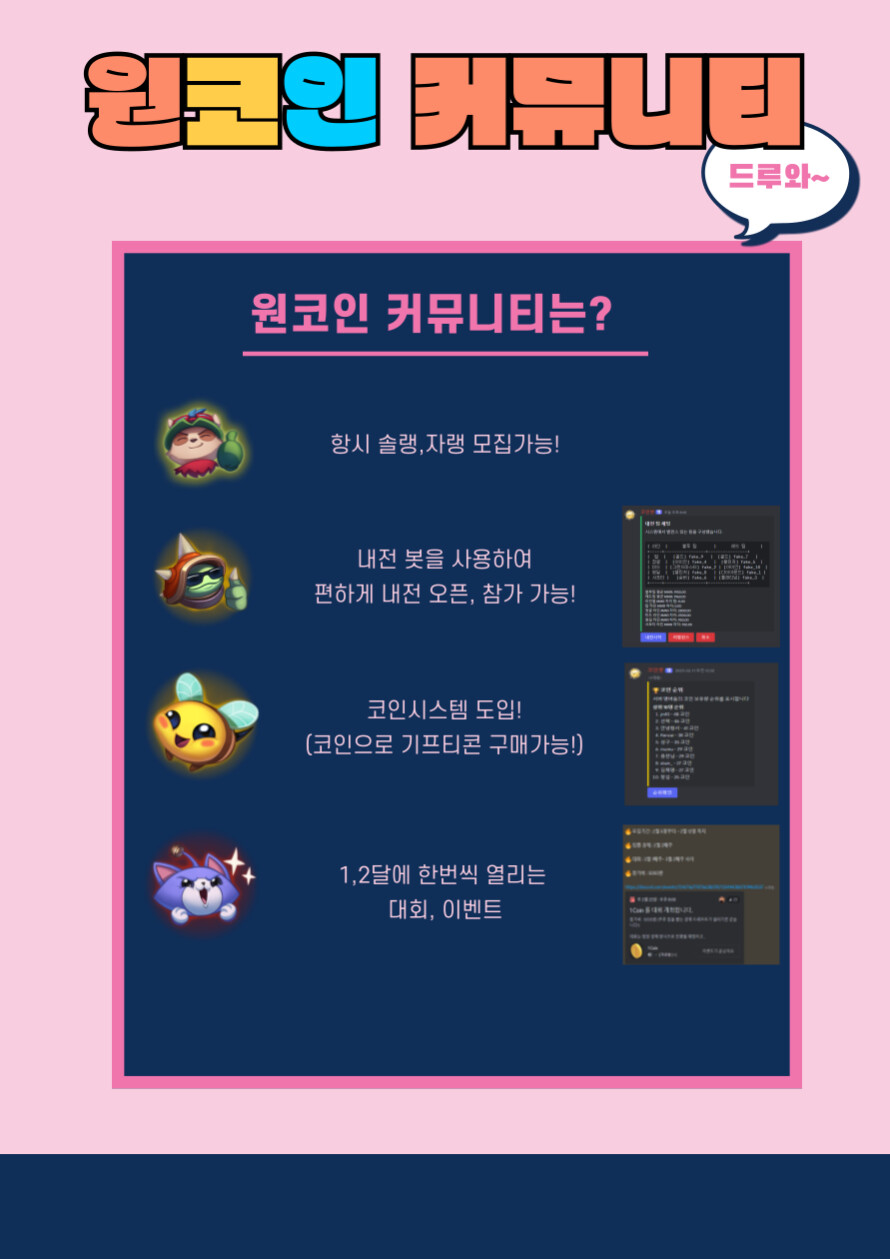원코인 커뮤니티 모집중입니다~!! 저희 커뮤니티는 보통 20~30 살 초중반으로 구성되어 있는 커뮤니티 입니다. 시간대는 오후 6시부터 활발한 편이며 듀오, 자랭 모집이 가능하고 일주일에 3,4 번정도 내전을 진행하며 가끔씩 대회 이벤트도 진행하고 있습니다. 저희는 따로 오픈카톡은 없습니다! 편하게 부담갖지 말고 들어와서 같이 게임해요~!