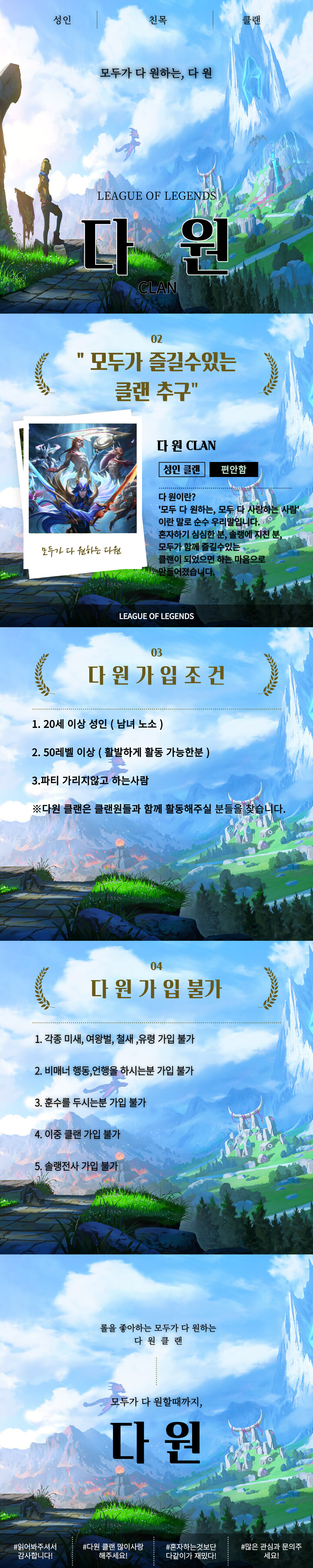 저희는 정원 50명으로 정해 소수 인원으로 잡고 돌아가는 클랜입니다 🙂 ​ 현재 내전은 인원이 적어, 내전 선호자도 구하고있습니다. (내전은 금 9시 토 7-8시에 열리고있습니다) ​ 저희는 주로 자랭이 잘 돌고 있으며, 파티 활동 주시간대는 저녁 6시부터 밤12시까지 입니다. 가끔 새벽까지 게임하시는 분들도 있습니다. ​ "​오전 오후 새벽 상관없이 활발히 활동하는 분들" ​ "친화력이 좋고 마이크 사용이 가능하신 분" ​ ​"적응이 힘들어서 한 곳에 정착하고 싶으신 분" ​ ​"즐겜 좋아하고 사람 좋아하시는 분"​​ ​ ​환영합니다!!!! ​ ​많은 관심 바랍니다.