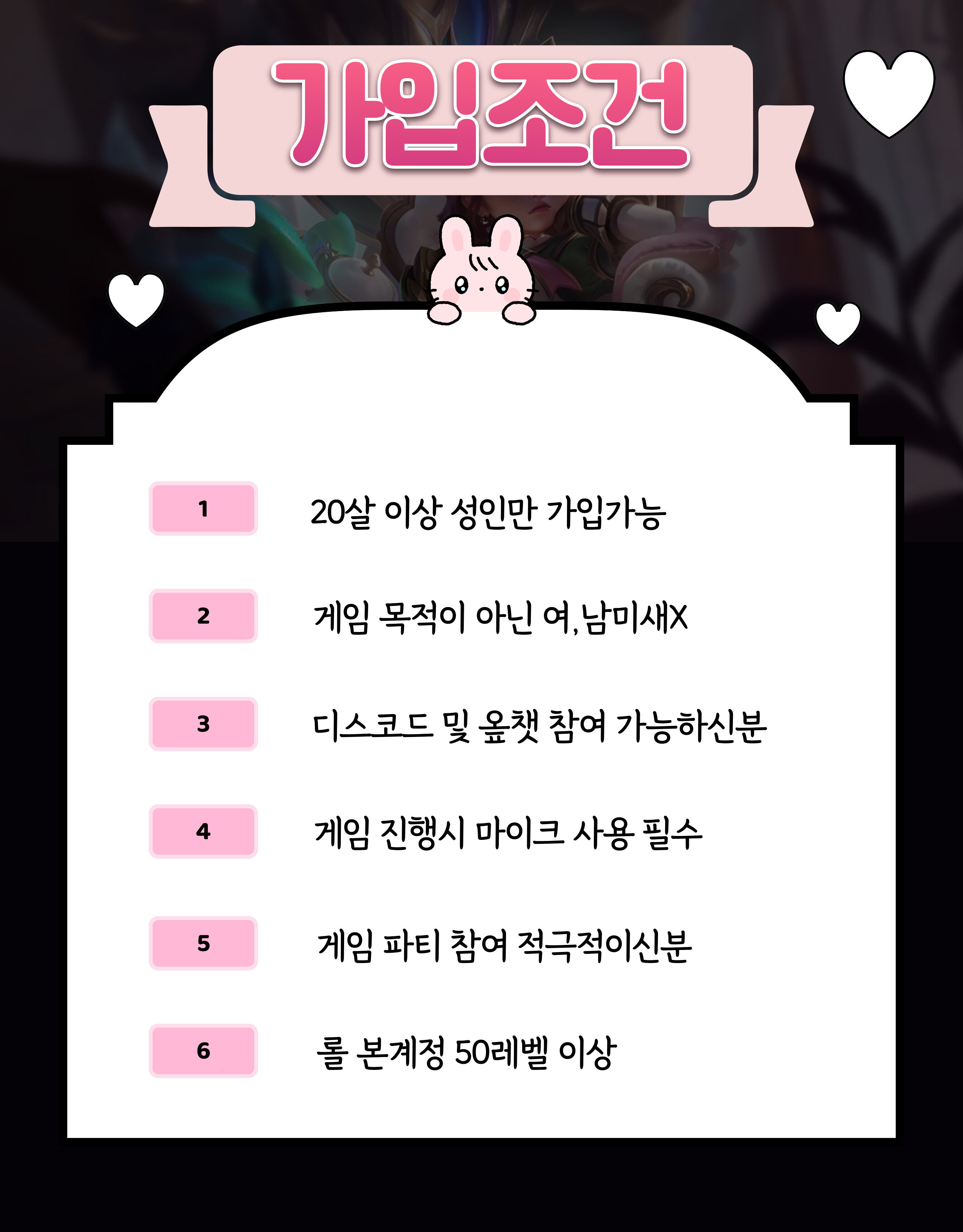 🚫 이런분은 거절합니다..! - 여, 남미새 게임이 목적이 아닌 이성친구를 찾으러 오신분 - 훈수, 남탓, 비하 등 분위기 흐리는 분 - 철세, 대리, 부계정