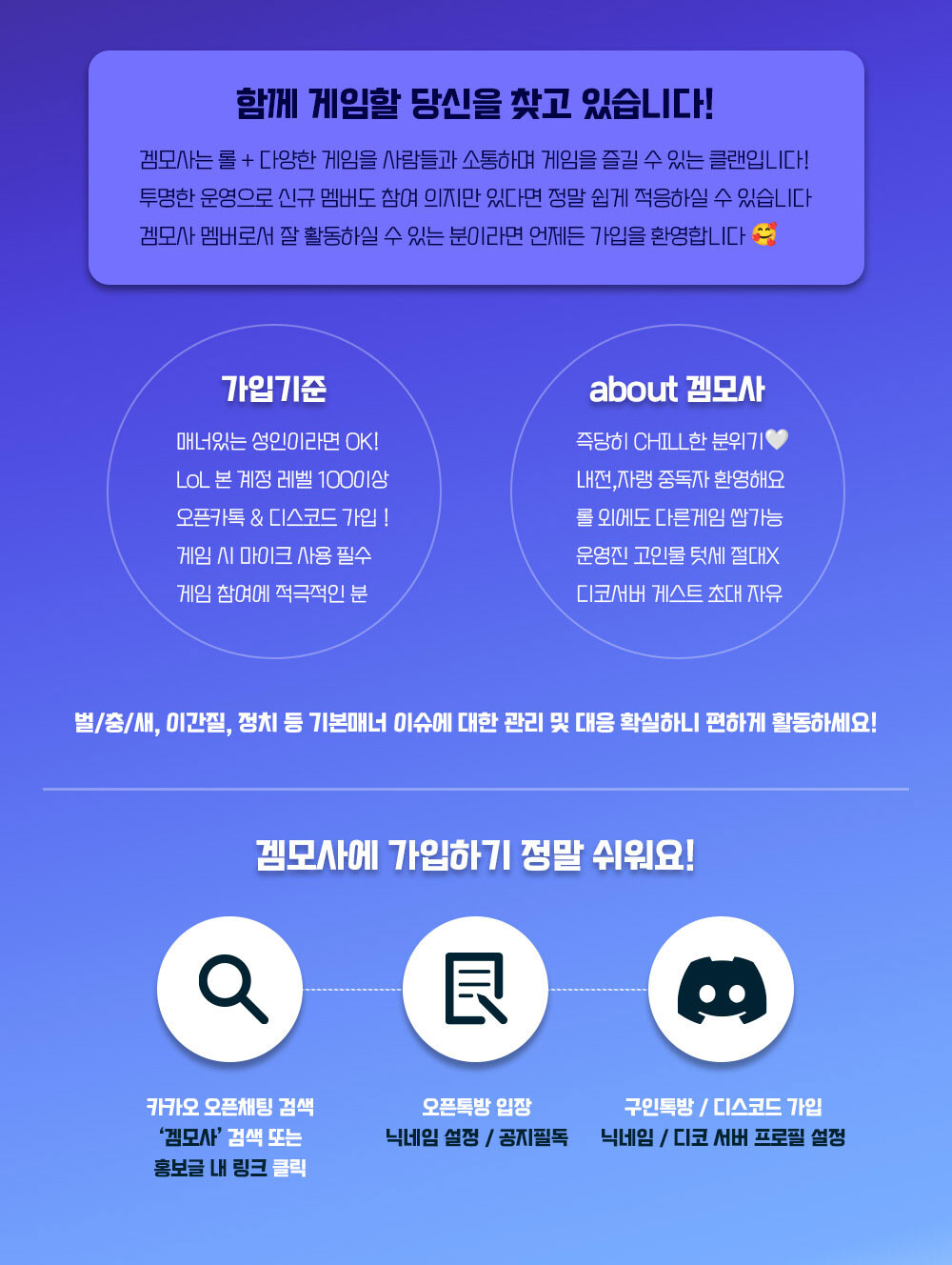 현재 저희는 내전, 자랭, 듀오, 칼바람, 롤체 같이하실 분들 구하고있고 **정글유저가 많이 부족한 상태라 정글유저 분들 위주로 모집**하고 있는데 **훈수, 찐텐, 싸움 등에 관심 없는 Chill guy 라면 어떤 라인이든 언제든 환영**합니다!
