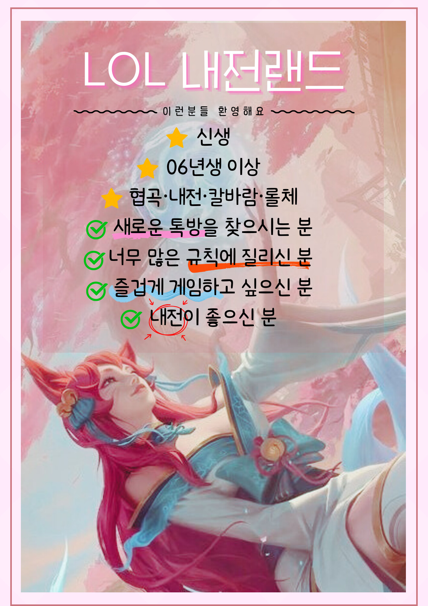 안녕하세요 🍀LOL 내전랜드🍀 입니다 🎀 𝐎𝐩𝐞𝐧 . 25. 05. 02 🎀 🔹 롤 신생 오픈카톡 친목 , 디스코드 커뮤니티 방 🔹 매일 내전 / 20인 경매 리그전 / 이벤트상품내전 진행중! 🔹 성인방 (06년생 이상 입장가능) 🔹 가입절차 X / 귀찮은 룰X / 음성안내X 🔹 게임 좋아하시는 분들 모두 환영합니다 🤗 🔸 모두 사이좋게 플레이합시다🔸