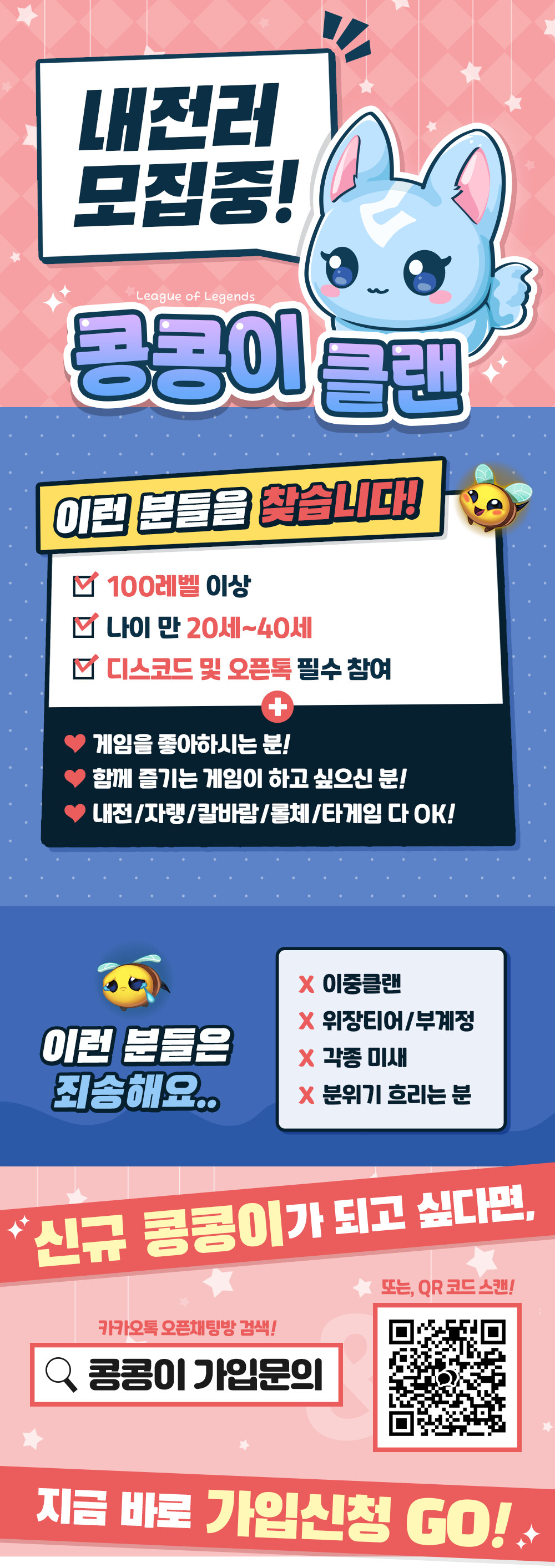 🎉 [League of Legends] 내전러 모집중! 🎉 💙 콩콩이 클랜 신규 모집 안내 💙 👀 이런 분들 찾고 있어요! ✔️ 100레벨 이상 ✔️ 나이 만 20세~40세 ✔️ 디스코드 & 오픈톡 필수 참여 🎮 게임을 좋아하고, 함께 즐기는 게임을 원하신다면? 내전 / 자랭 / 칼바람 / 롤체 / 타게임 다 환영합니다! ❌ 이중클랜, 부계정, 무단이탈, 분위기 흐리는 분은 죄송해요 💦 🔍 가입문의: 카카오톡 오픈채팅방 [콩콩이 가입문의] 검색! 📱 또는 이미지의 QR코드 스캔! 🔥 지금 바로! 새로운 콩콩이가 되어보세요! GO GO 🔥 오픈카톡 가입 문의방 : https://open.kakao.com/o/g3bkK5Wg