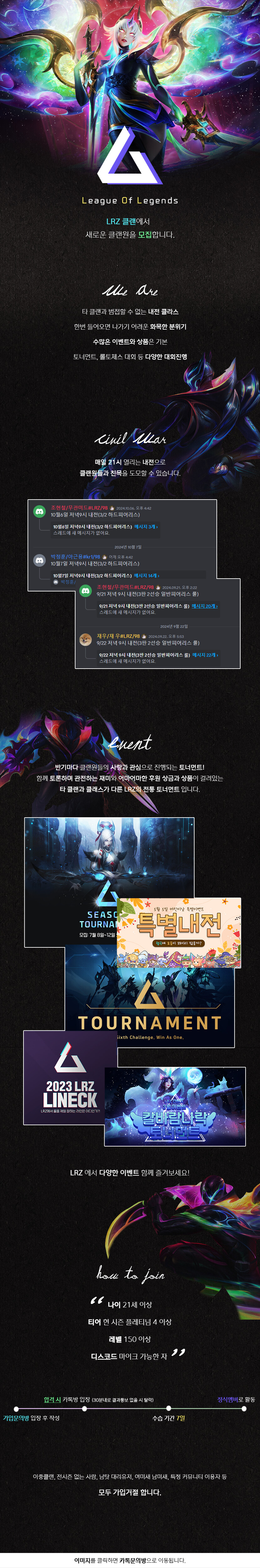 분기별 다양한 이벤트와 내부 토너먼트! ★7월달부터 신규 유입을위한 클랜내부 이벤트 진행예정★ 전라인 매우 환영 + ( 서폿 ) !!! 가끔씩 다같이놀러다니고 서울정모도 많음 ! 가입문의방은 아래 링크 클릭해주시면 됩니다~