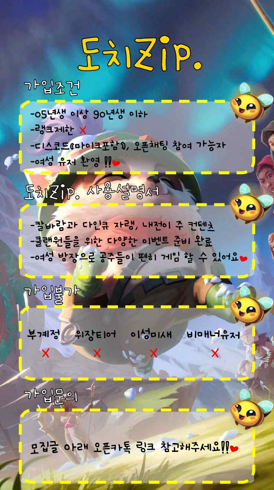 안녕하세요 성인 롤 친목클랜 '도치Zip' 에서 신규 인원 모집합니다! 가입 조건은 위와 같으며 관심 있으신 분들은 오픈카톡 링크 찾아와주시면 감사하겠습니다