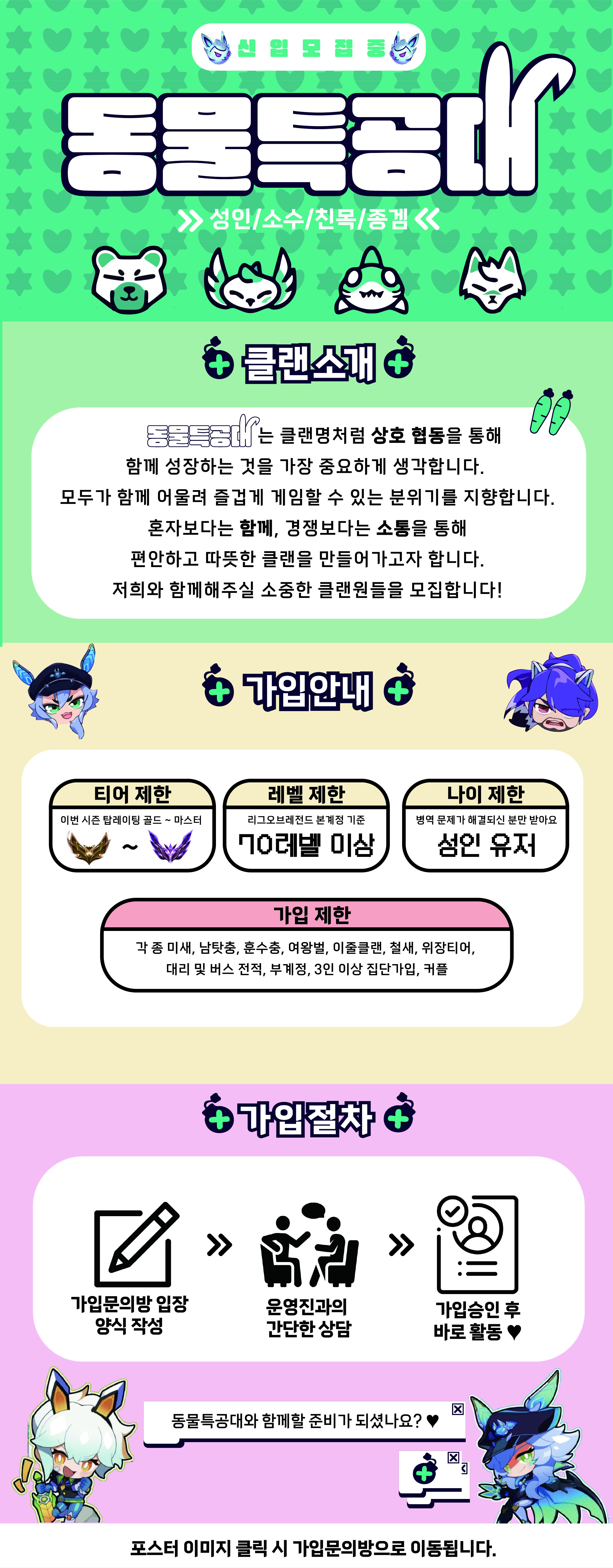 게임 실력보다 소통과 매너를 더 중요하게 생각하신다면, 지금 바로 동물특공대에 함께 해보세요! 함께 웃고, 함께 성장할 새로운 특공대원을 기다립니다. 🐻🦉🦈🦊 📝 가입 문의 : https://open.kakao.com/o/gyDt0gGh