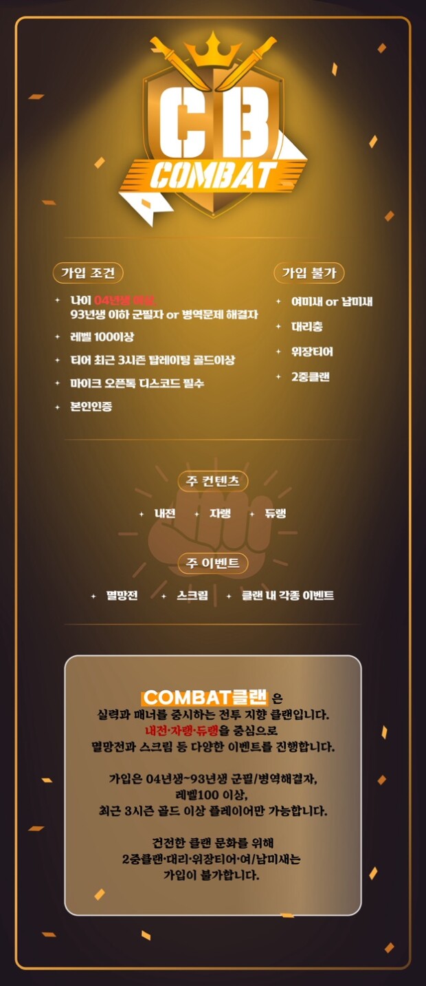 [가입 조건] 나이: 2004년생 이상 ~ 1993년생 이하 군필자 / 병역 문제 해결자 레벨: 100 이상 티어: 최근 3시즌 탑 레이팅 골드이상 필수: 마이크 · 오픈톡 · 디스코드 사용 가능 본인 인증 必 [가입 불가] 🚫 여미새 / 남미새 🚫 대리 / 위장티어 🚫 2중 클랜 가입자 [활동 컨텐츠] 내전 / 자랭 / 듀랭 [주 이벤트] 멸망전 /스크림 / 스크림 팀 운영 [우리 클랜은 이런 분을 찾습니다] 실력 향상에 진심인 분 팀플레이와 매너를 중시하는 분 활발히 소통하며 함께 성장할 🎯 함께 싸우고, 함께 성장할 팀원들을 기다립니다.