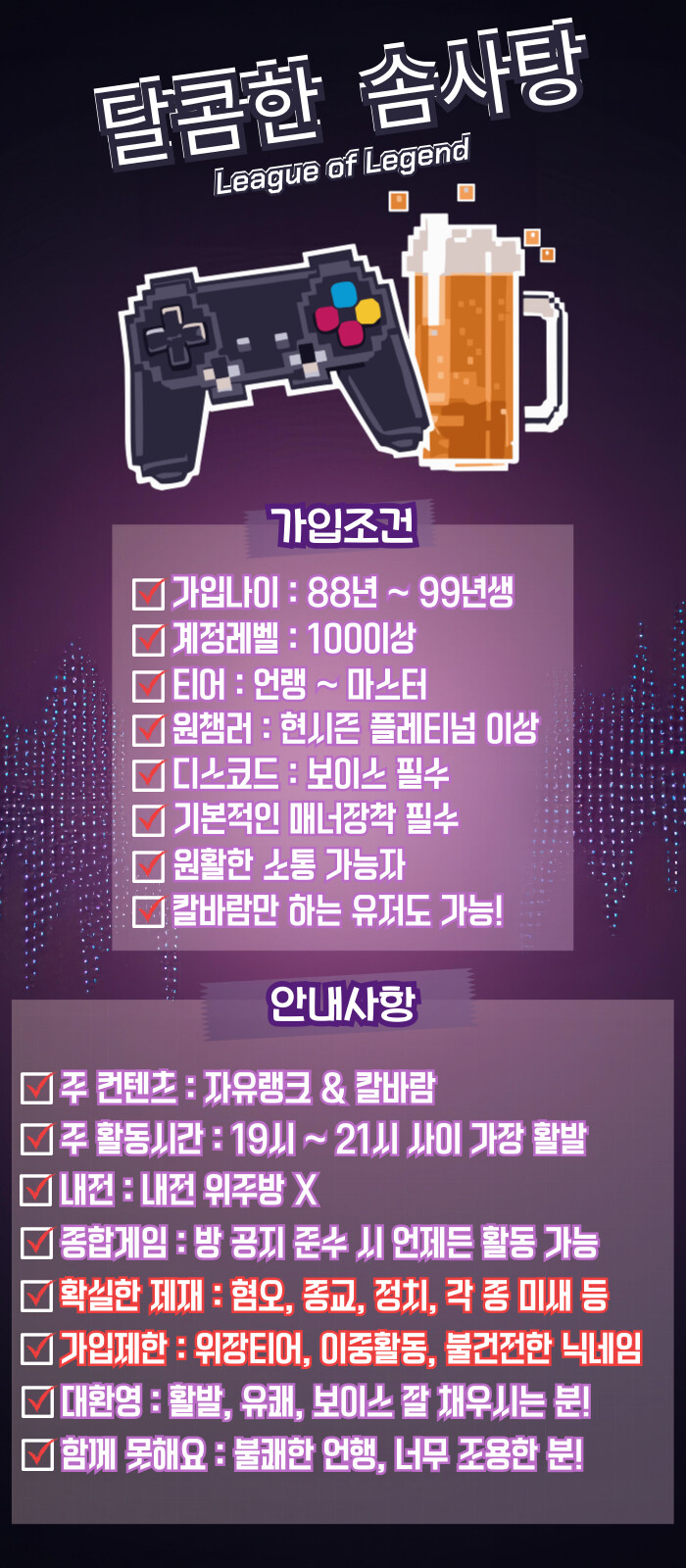 - 진지빡겜 보단 재밌게, 듀오보단 5인큐 선호방