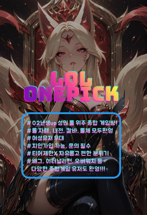 💜신생롤 LoLOnePick💜롤원픽 신생30대롤클랜 클랜원 모집합니다. 🎮 롤원픽 클랜 모집 🎮 안녕하세요! 02년생 이상 성인 유저만을 위한 롤원픽 클랜입니다. 롤을 사랑하는 모든 유저들, 그리고 다양한 종합게임을 즐기는 분들을 위한 열린 공간입니다. 누구나 편하게 함께 할 수 있는 클랜을 만들고 있습니다💜 💜