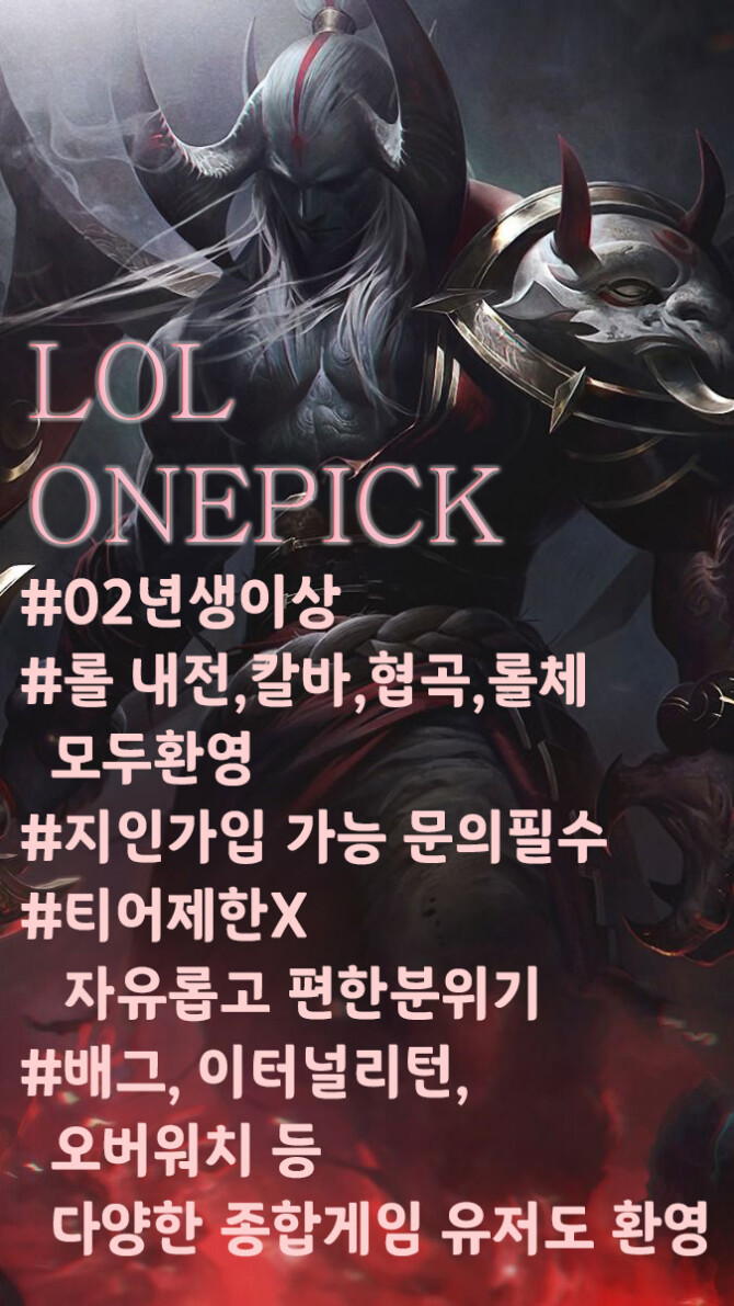💜신생롤 LoLOnePick💜롤원픽 신생30대롤클랜 클랜원 모집합니다. 🎮 롤원픽 클랜 모집 🎮 안녕하세요! 02년생 이상 성인 유저만을 위한 롤원픽 클랜입니다. 롤을 사랑하는 모든 유저들, 그리고 다양한 종합게임을 즐기는 분들을 위한 열린 공간입니다. 누구나 편하게 함께 할 수 있는 클랜을 만들고 있습니다💜 💜