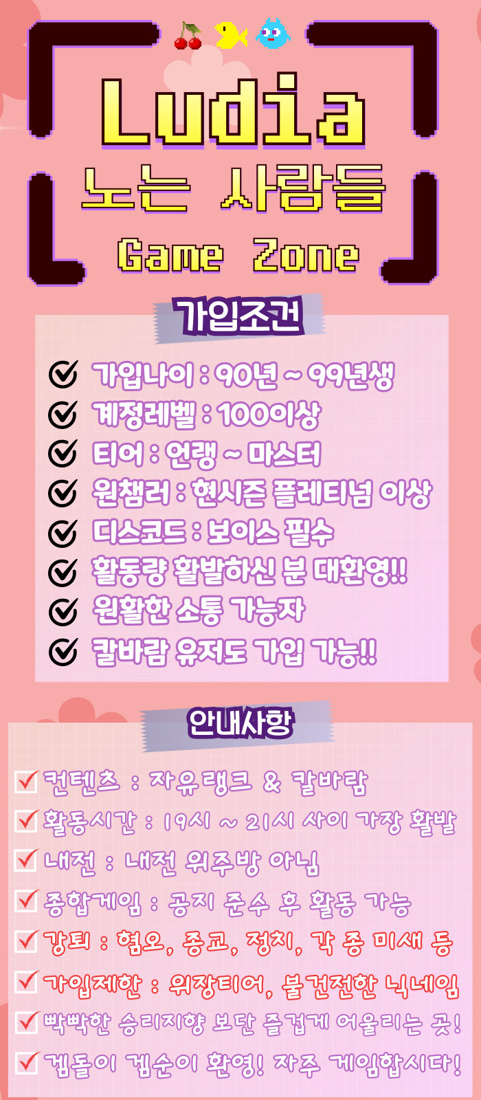- 현재 인원은 20명이 되지 않지만 같이 성장하실 분!! - 19시부터 게임 자주 하시는 분 모집중! - 수습기간, 닉변 없음! - 가입문의 아래 링크 눌러주세요!!