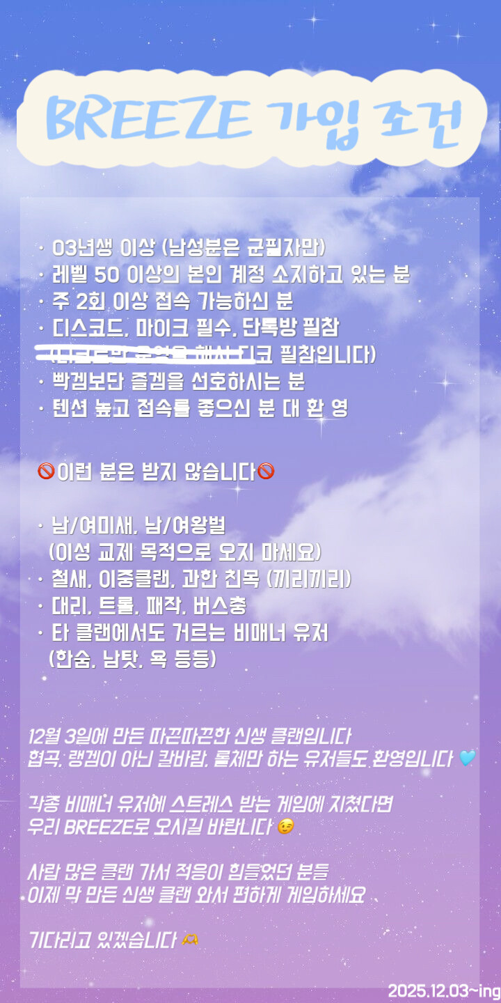 현재 24명입니다! 아직 소수라서 친목, 편 가르기 이런 거 전혀 없습니다! 마음 편하게 오세요 🩵 티어 제한 없이 모두가 즐길 수 있는 클랜을 만들고 싶었습니다 협곡, 랭겜이 아닌 칼바람만 하시는 분, TFT만 하시는 분 다 환영입니다! 빡겜하면서 스트레스 받는 것보단 즐겜 위주로 돌아가길 바랍니다 :)