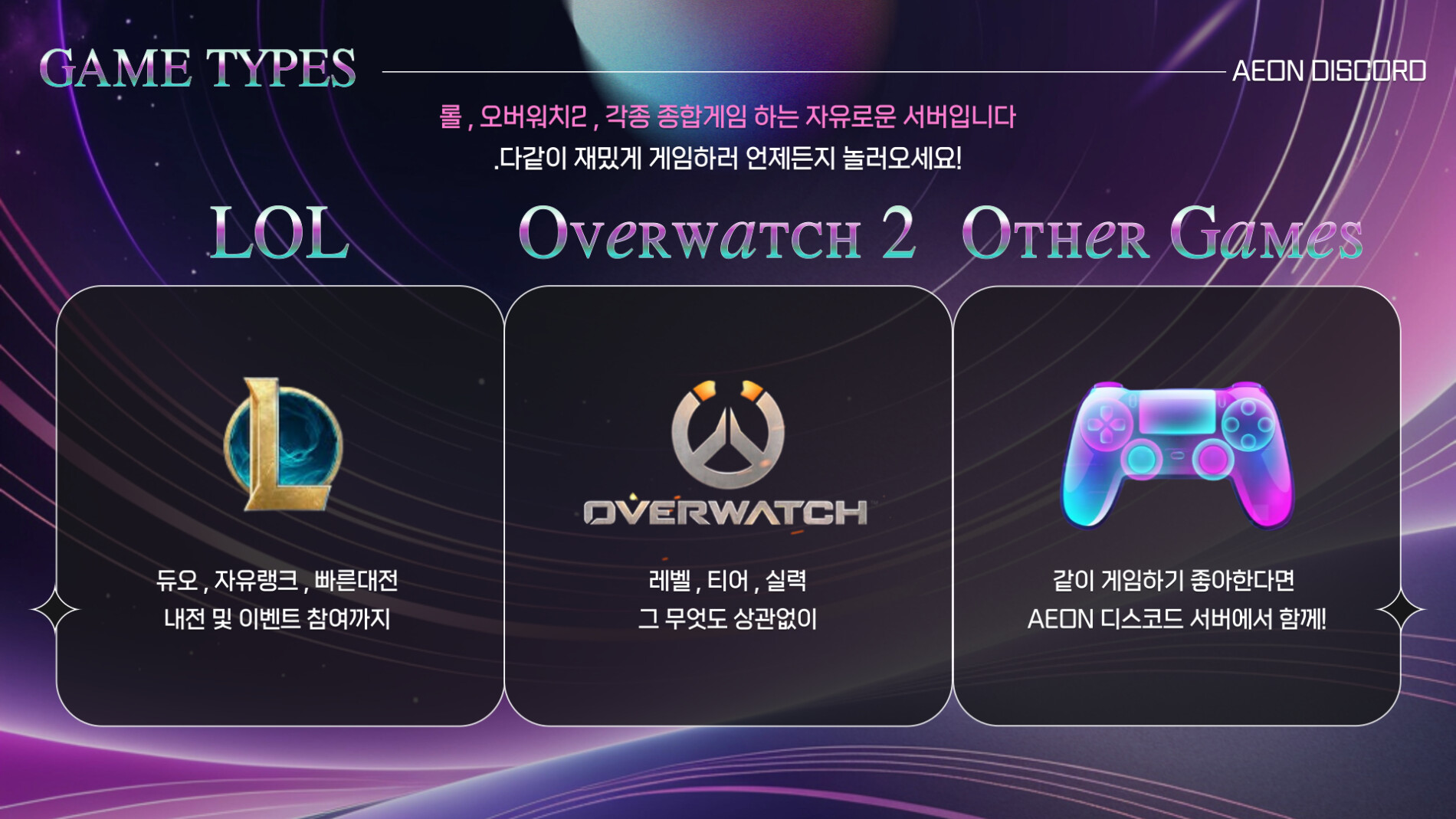 ✨AEON 디스코드 서버에서 같이 재밌게 게임 하실 사람들을 구합니다!✨ ✔ 롤, 오버워치 & 종합게임 자유로운 디스코드 서버 ✔ 매달 이벤트 및 내전 참여 가능 ✔ 분쟁없는 클린한 서버 ✔ 게임을 잘하는 사람도 못하는 사람도 다 같이 재밌게 ✔ 언제든지 게임하러 오세요