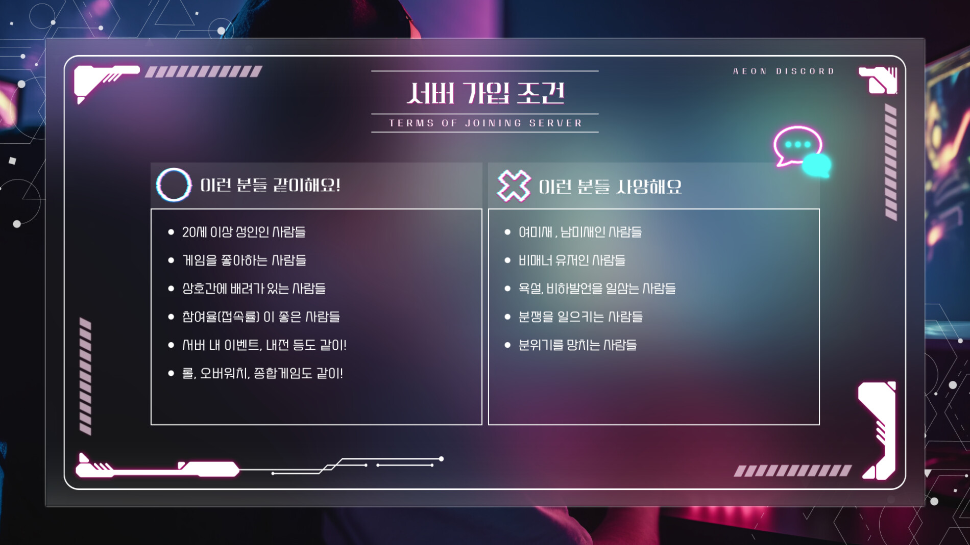 AEON 디스코드 서버에서 같이 재밌게 게임 하실 사람들을 구합니다! ✔ 롤, 오버워치 & 종합게임 자유로운 디스코드 서버 ✔ 매달 이벤트 및 내전 참여 가능 ✔ 분쟁없는 클린한 서버 ✔ 게임을 잘하는 사람도 못하는 사람도 다 같이 재밌게 ✔ 언제든지 게임하러 오세요 디스코드 주소 : https://discord.gg/tnxUXjDX7T