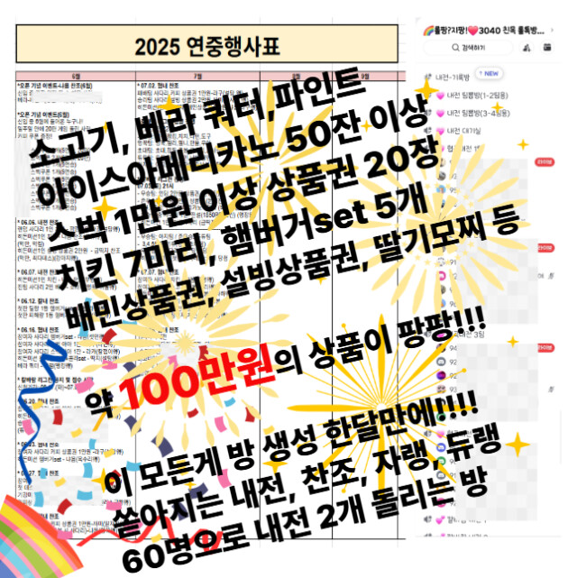 0. 소개글 혼자서 게임하는 사람들에게 함께하는 즐거움을 주기 위해 만든 친목 롤톡방입니다. 저희 방은 최소 1년 이상의 롤톡방 운영 경험이 있는 사람들이 모여 보다 나은 방을 만들고자 개설하였습니다. 다른 곳에서 느끼시지 못한 즐거운 게임을 위해 노력하겠습니다. 현재 인원 68명 (총원 70명) 1. 가입 조건 - 2 시즌내 그랜드마스터 티어 이하 - 신규아이디 제한 (특별한 사정이 있을 경우 상담 가능) - 이중방은 가입 불가합니다. 2. 주 컨텐츠 - 자유랭크 , 듀오랭크 , 롤토체스 , 일반게임 , 내전, 스팀게임 - 클랜 자체 리그 운영 예정 중이며 1~4등 팀 및 다수의 인원에게 상금 및 상품이 있습니다. 티어가 낮더라도 부담없이 참가 가능합니다. 3. 우대조건 - 커플 환영 - 동반 입장은 최대 4인(본인 포함)까지 가능합니다. - 미드, 정글, 탑 선호 4. 클랜 내 진행 중 이벤트 - 2025.07.05 칼바람 이벤트전 완료 5. 가입 거절 인원 - 여미새, 분탕, 상품 목적 가입을 원하시는 인원은 가입은 받지 않습니다. 위와 같이 특별히 이상한 사람들이 아니면 누구든 환영이며 같이 게임하고 즐기며 소통하실 분들 모집합니다. 정모 및 벙은 주기적으로 진행 중이며 같이 게임하는 사람들 만나고 싶으신 분들도 환영!