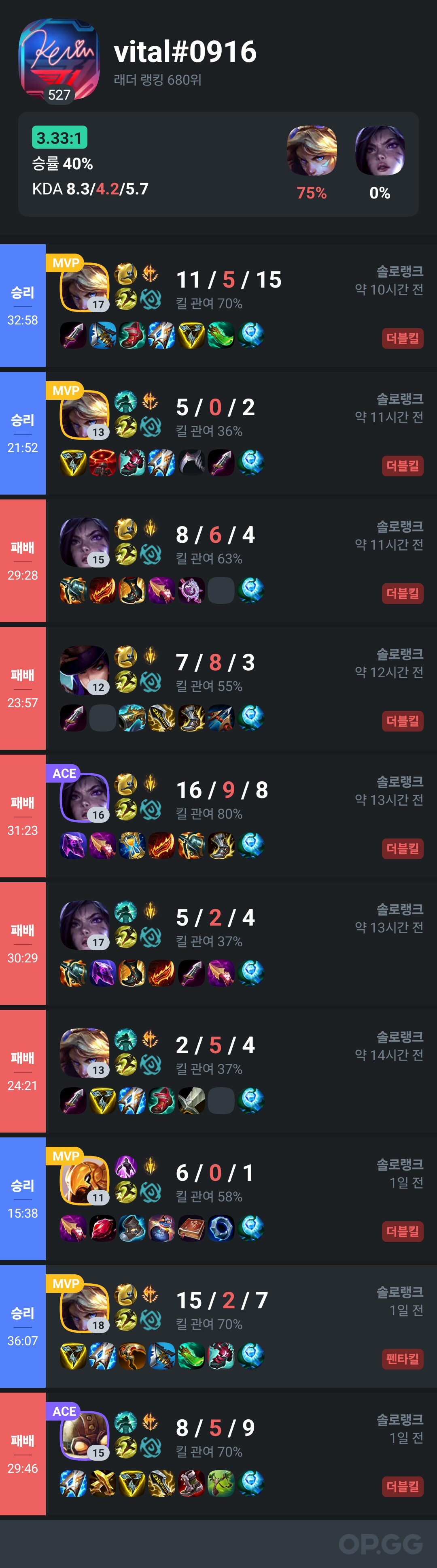 지금 농심 서폿인 바이탈 최근 솔랭 전적인데 싹 다 원딜로 도배가 되어있음