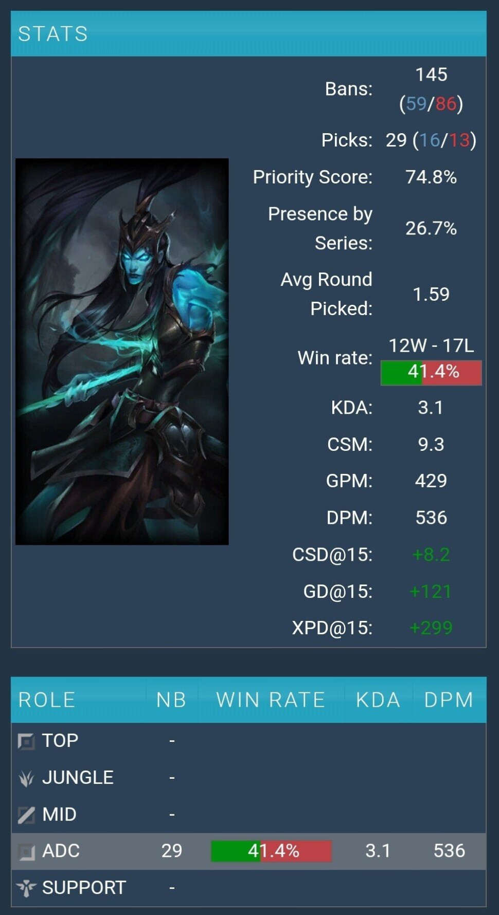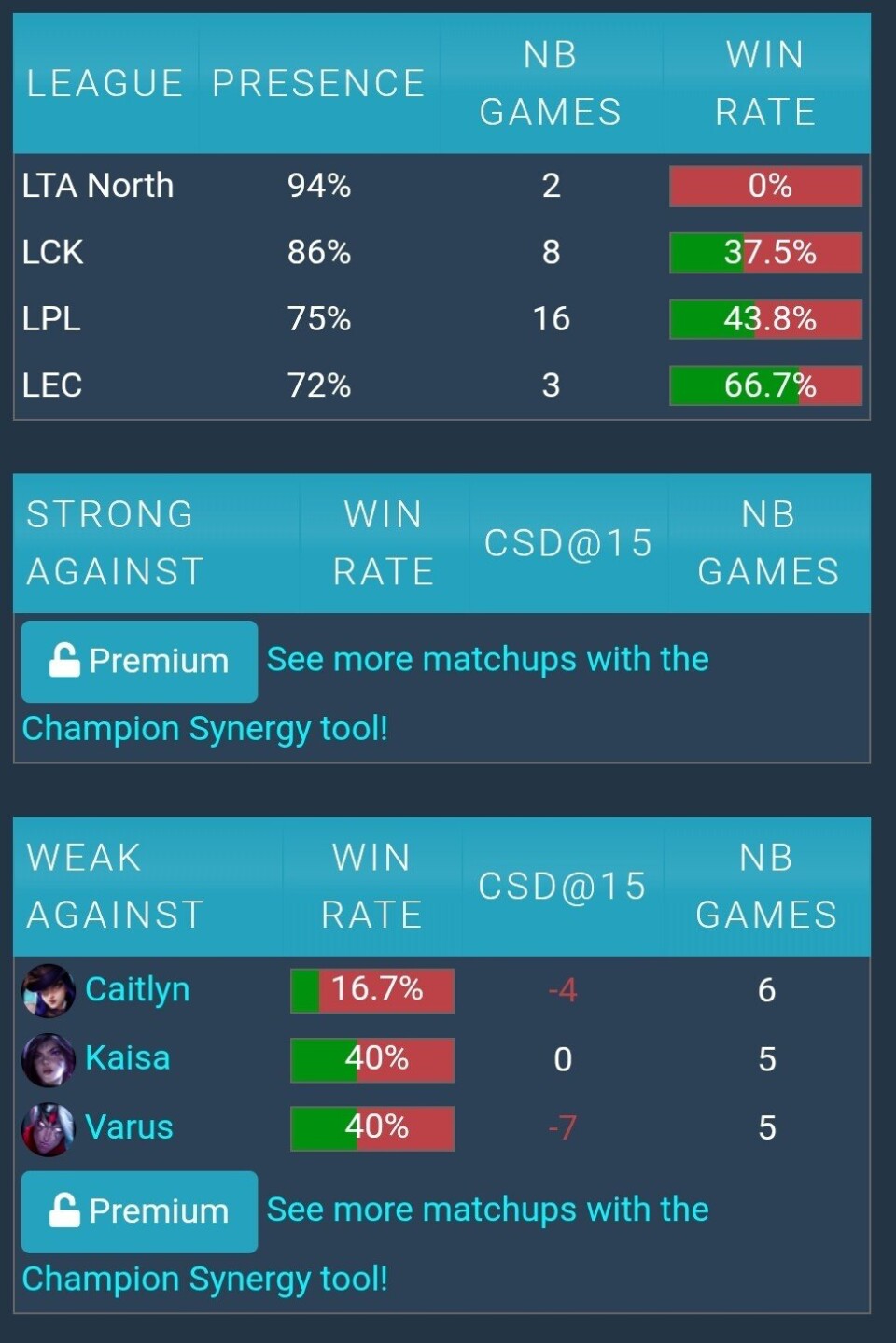 여전히 초반 주도권은 우세한데 승률이 40대까지 떨어짐 아무래도 개막 일찍한 LPL이 지표가 많은데 43대에 머물고, 칼리스테가 두번 뽑고 모두 이긴 lec 제외하면 나머지 리그도 저승률 추세. 바루스를 상대가 안되는 것도 있는데 케틀(보통 니코 카르마같은 주도권 서폿과 연계) 상대 승률이 너무 낮은 것이 상징적. 다만 LPL의 경우 최근 패치버전으로 전환하면 57.1퍼까지 올라오고 있어 더 지켜볼 필요 있음