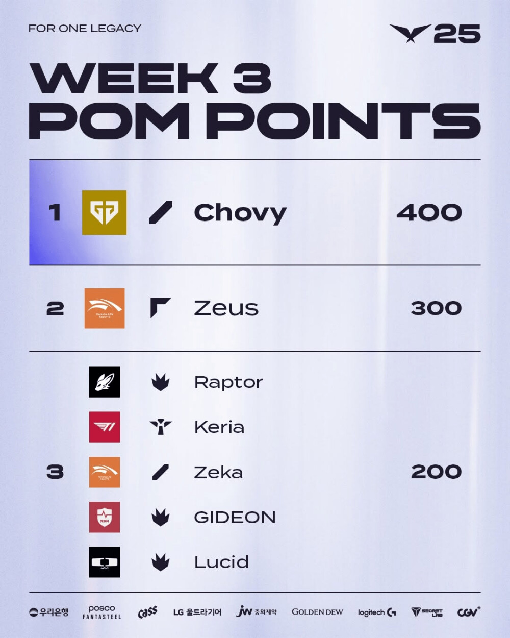 [2025 LCK] 3주 차 순위표 & POM 순위표