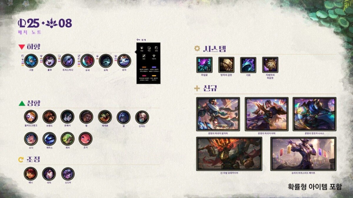 25.08 패치에선 그웬·룰루·트리스타나·요네·요릭·유미가 너프를 받았다. 블리츠크랭크·브랜드·흐웨이·멜·레넥톤·쉔·신지드·소나·제라스·제리·조이는 버프 대상이 됐다. 애니·아리·신드라는 스킬과 스탯의 너프·버프가 동시에 이뤄졌다.
