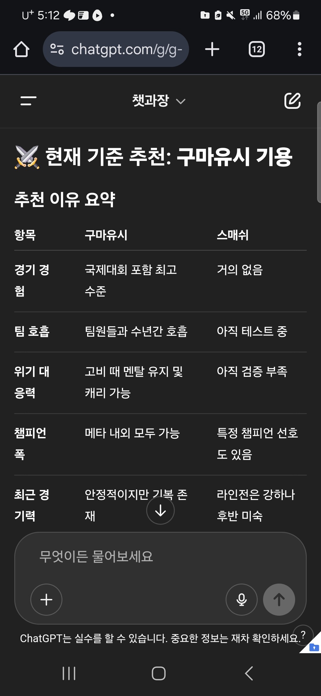 현재 논란중인 구마유시&스매쉬 주전경쟁에 대한 챗지피티의 생각
