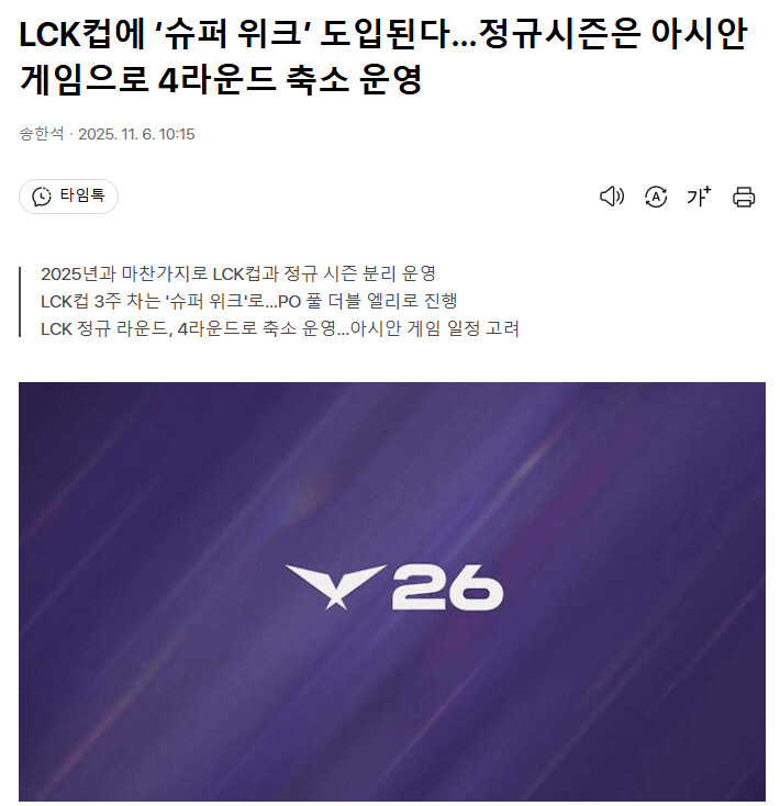 2025년 후반기가 3~5라운드로 치러졌지만 2026년 3~4라운드로 진행되는 이유는 아시안 게임에 대비하기 위함이다. 2026년 일본의 아이치-나고야에서 열리는 아시안 게임에 LoL이 정식 종목으로 채택되면서 LCK를 축소 운영해야 하는 상황을 맞았다. LCK는 한국 대표로 출전하는 선수들의 대회 일정은 물론 호흡을 맞출 수 있는 기간까지 배려해 대승적인 차원에서 정규 시즌과 플레이-인 일정을 축소하기로 결정했다.