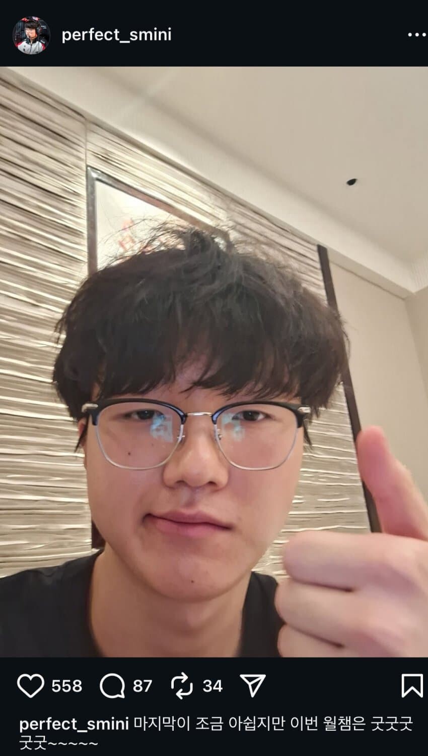 이게 정녕 월즈 결승 통신사대전 5꽉 패배한 선수 인스타? ㅋㅋㅋ 멘탈 걱정은 안되네ㅋㅋㅋ 내년에는 칼챔까지 잘하는 세최탑이 되보자 승민아~
