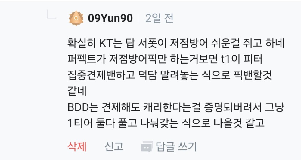 그저께 있던 글에 KT T1 시리즈 예상했던 글인데, 사실 난 저때까지 저게 맞을줄 알았는데 오늘 막상 되고나니 BDD견제 개빡으로하고, 덕담폼 별로라 혼자서 좀 말리고, 퍼펙트가 저점방어픽으로 미친고점 뽑아주고, 4 5세트 신인이슈로 픽밴견제 안했던것까지 그날그날 컨디션차이가 있다하긴해도 이정도로 못맞출줄은..;