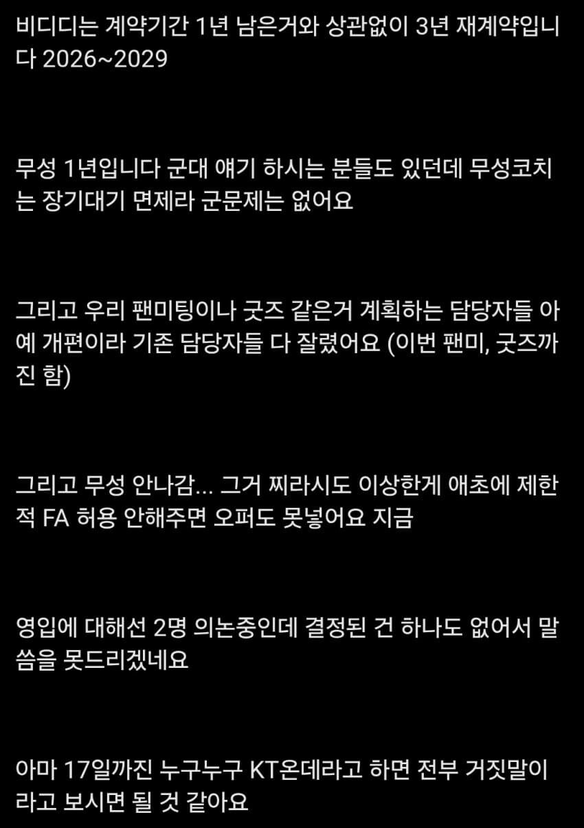 뭐 전원 재계약이다, 서폿 2군이다,베릴 영입한다 이딴거 믿으면 정신건강에 안좋아서 이것만 믿고 걍 결과 나올때까지 대가리 깨야겠다 레츠 고 kt 바이퍼 kt 딜라이트 kt 페이즈 kt 카엘