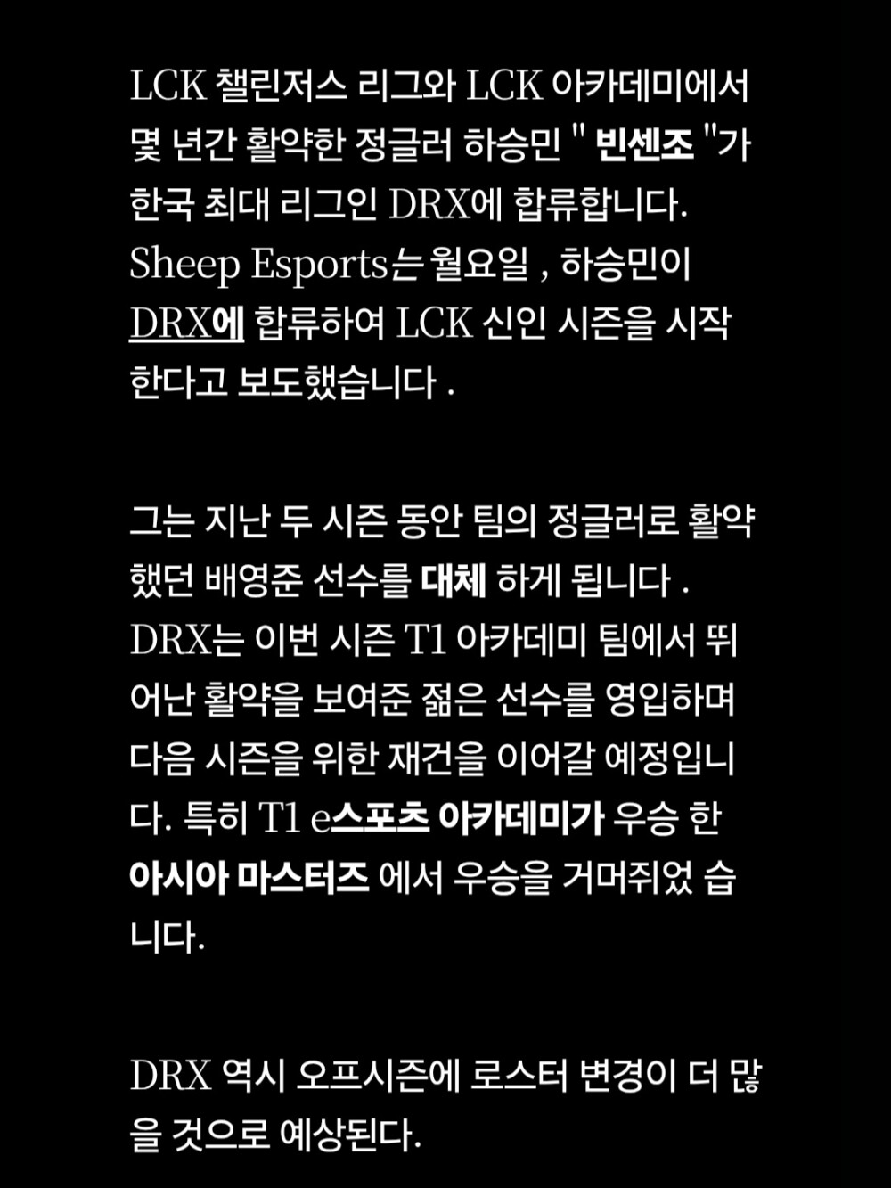쉽 스포츠)T1 cl 빈센조 DRX합류예정
