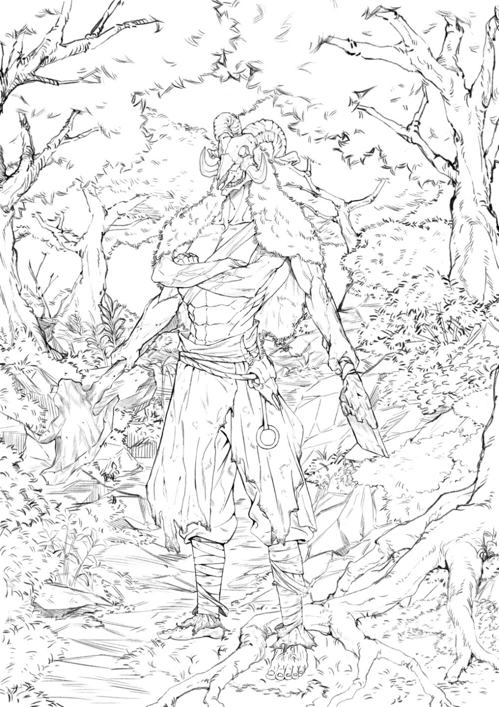 숲속에서 머리가 염소해골인 팔 4개 달고있는 건장한 괴물이 서있는 그림