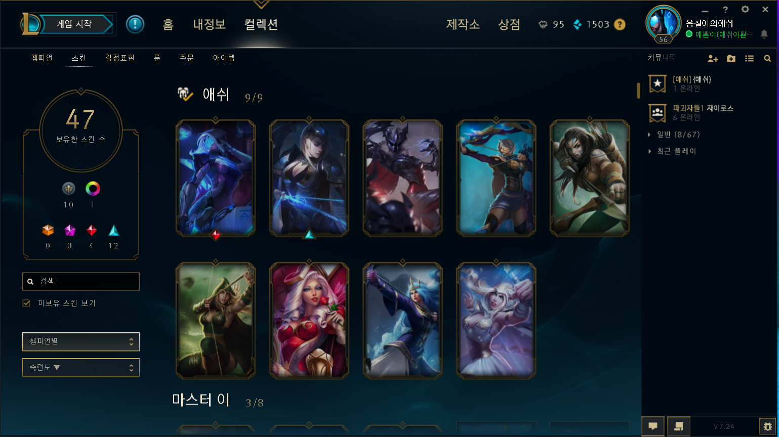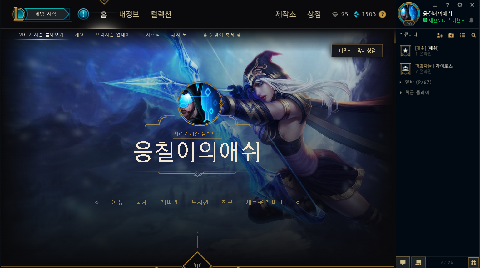 시즌7에 롤을시작하여 애쉬를하게된 실레기롤유저입니다 어느새 올스킨을만들어버렸네요ㅎㅎ..리뷰하겠습니다 재밌게봐주세용~