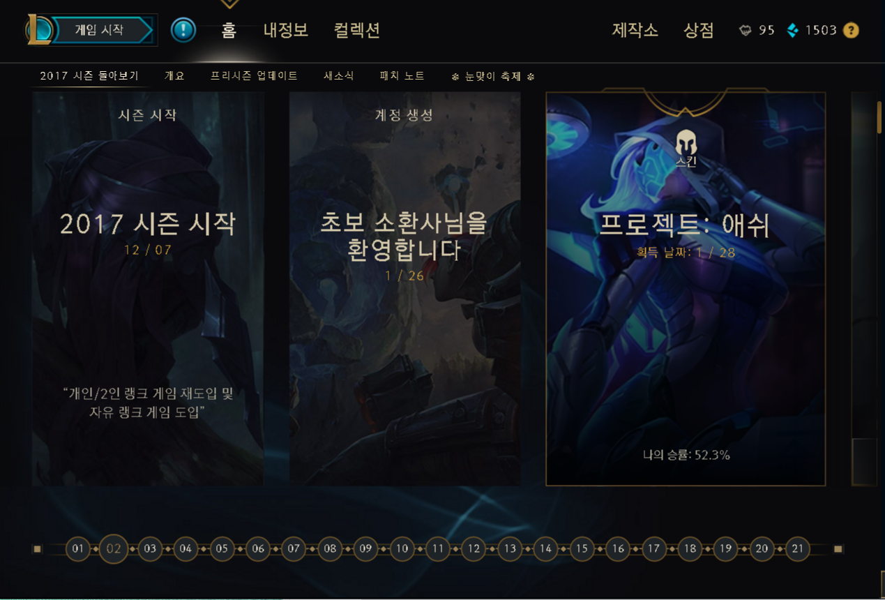 9.프로젝트애쉬(별다섯개중다섯개)이스킨은 그냥 말할것도없이 걍짱이다 기지에서어는정도거리를지나면 가면벗는게 너무간지이다 w쓸때 머리를숙이시지 이대사가 너무맘에든다 그리고 제일답답한 평타모션이 바껴서 너무좋다 (애쉬할꺼면꼭사삼 ) 아 그리고 롤하자마자2일뒤에 프젝애쉬스킨샀음 (프로젝트애쉬 왼쪽에 잘보면 프로젝트에코일러스트가보인다) 프젝애쉬 스킨출시때 내가롤을안해서 아이콘이랑 테두리가없음