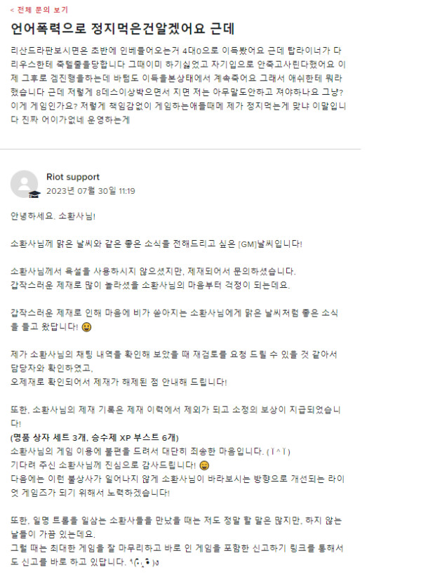 롤 14일정지 진짜 개빡쳐서 문의로따졋더니 풀림