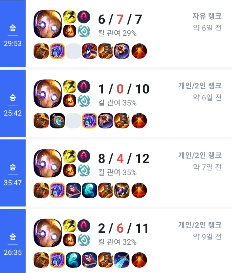 아우솔 리워크이후 서폿픽만 하거나 랜덤라인으로 블츠로 날먹하는데, 정글블츠 승률이 7~80프로 이상에 탑 블츠로 다리,갱플 더블킬을 혼자 해먹는 딜 블츠49만 '즐겜'유저에 템트리는 즐겁지만^^ 이겨먹으려고 게임을 굴리는 스타일임.