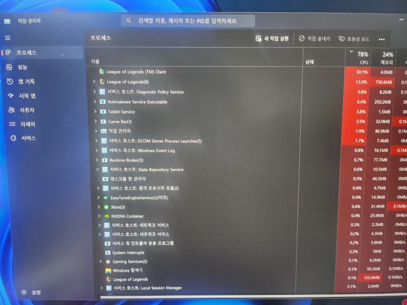 다른 게임 및 프로그램(철권8, 카스 2, 다크소울3, 유니티, 언리얼엔진5)들은 다 잘됨(롤만 안됨) 롤 재설치 했는데 안됨 그래픽카드 업데이트 했는데 안됨 메인보드 바이오스 업데이트 했는데 안됨 구라제거기(금융, 보안프로그램 제거) 돌렸는데 안됨