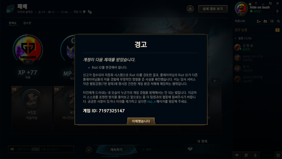 방금 hide on bush 닉네임 썼다고 제재 당했는데