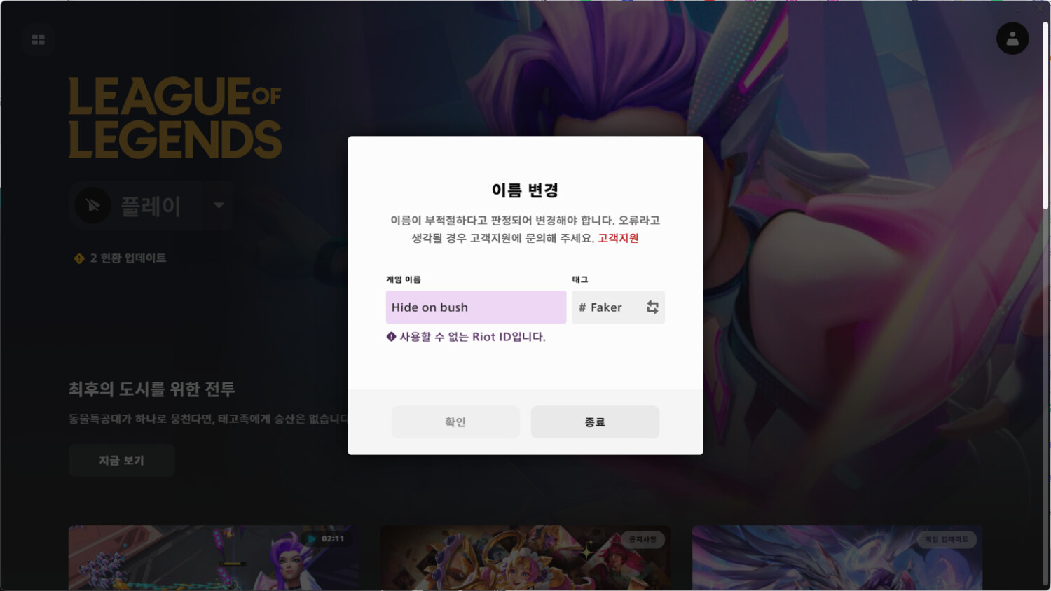 이게 말이 되는 거임? 다시 hide on bush로 바꾸려고 해도 안 됨