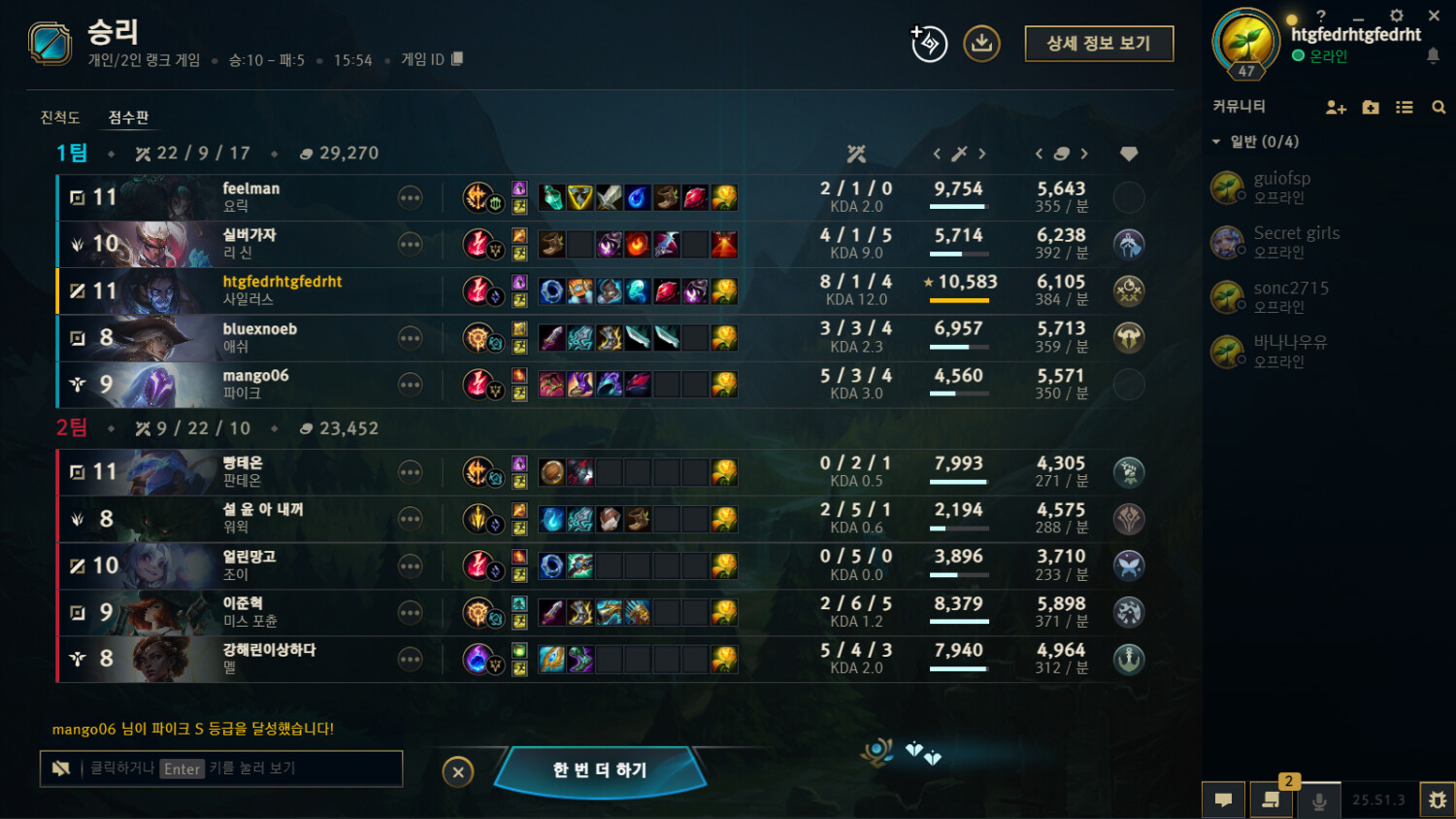 일겜 돌리면 가끔 마스터나 다이아도 나오는데 랭겜 돌리면 무슨 게임 처음 하는 애들만 나오는 듯