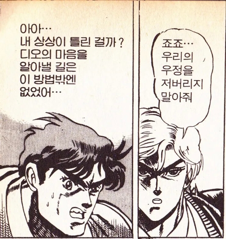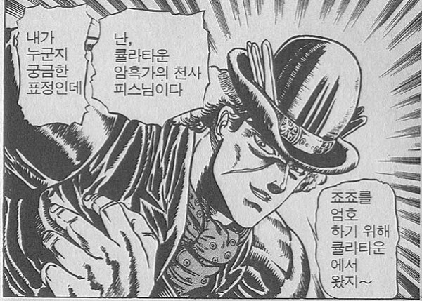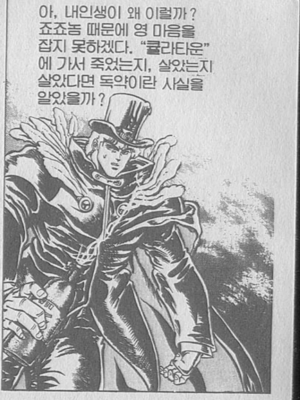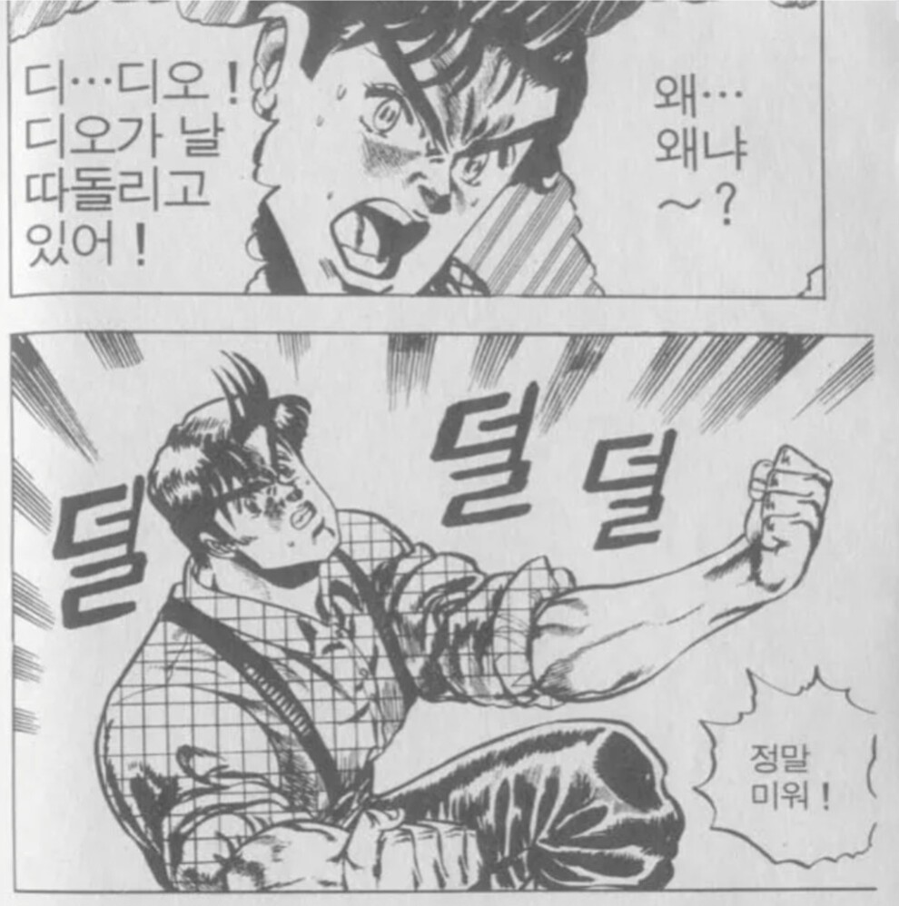 원본 디오: (최근! 나는 아무래도 이상하다! 마음이 성난 파도와도 같다! 어째서인가? 죠죠 녀석 때문이다! 이 디오의 인생은 그놈 탓에 꼬이기 시작했다! 죠죠 녀석, 오거 스트리트에서 횡사했을까? 그것이 궁금하다! 설마 약의 증거를 잡은 건 아니겠지?! 대체 어느 쪽이냐?!)