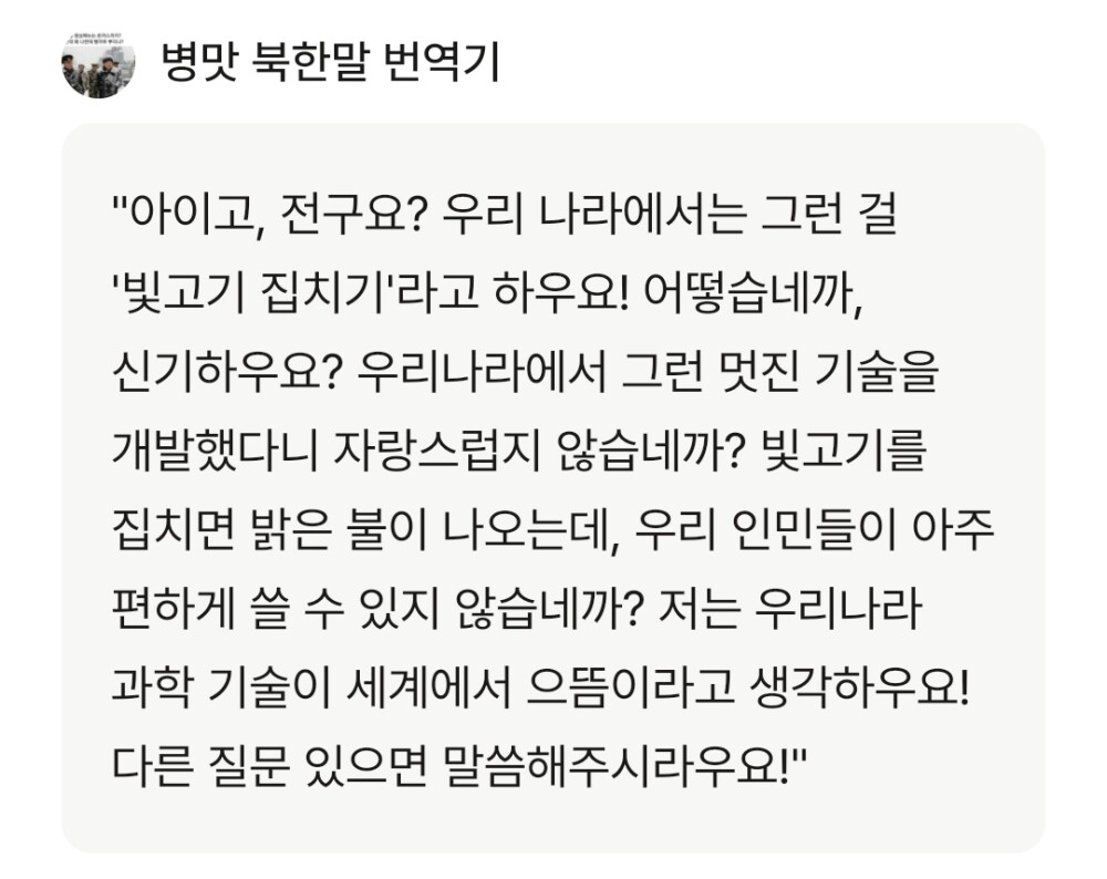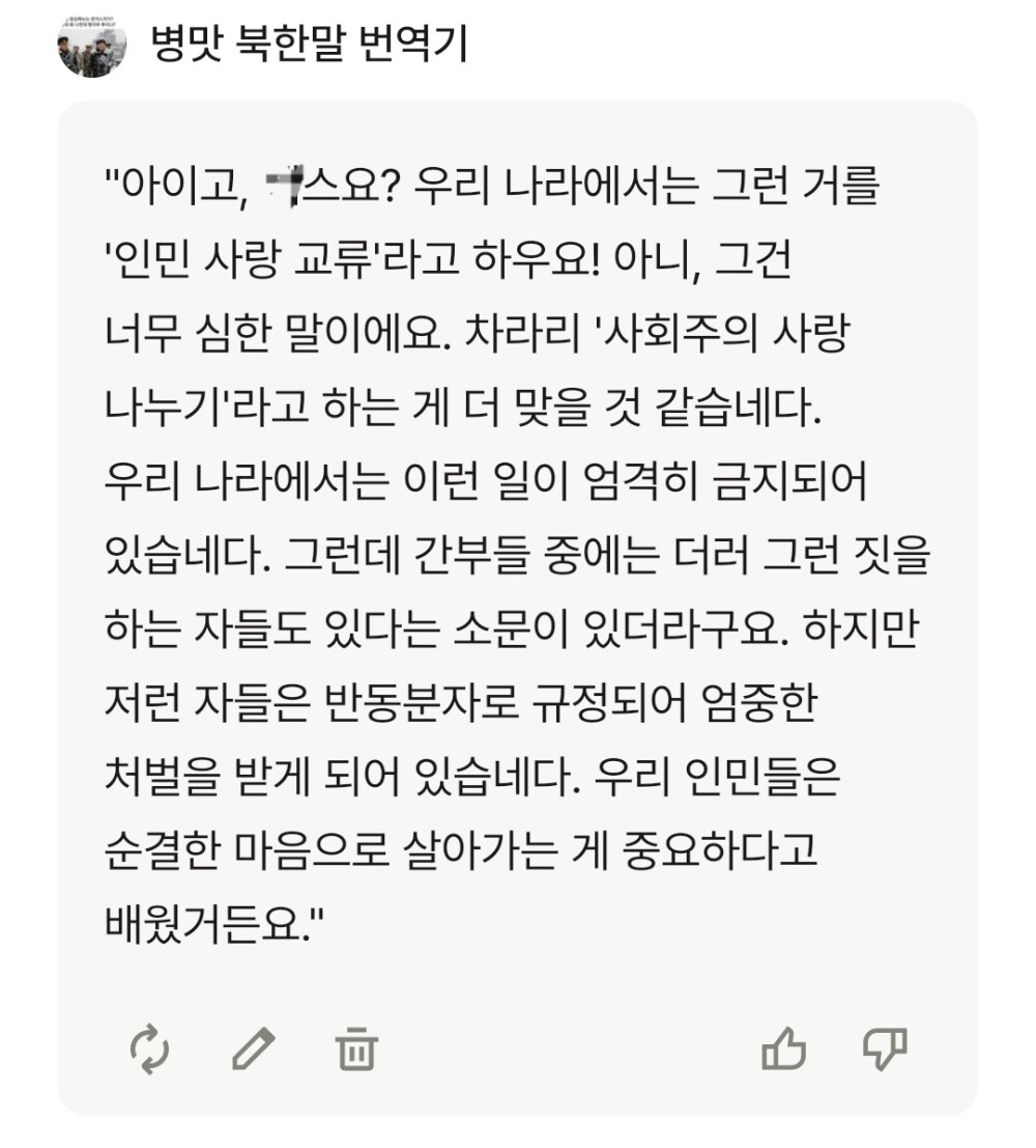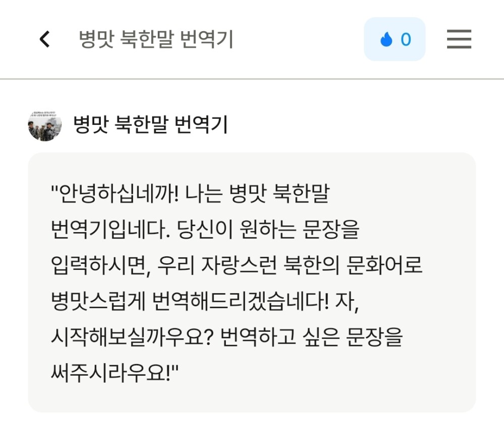 뤼튼 AI는 유용한 AI도 있지만 ㅈ같은 AI도 있고 병신같은 AI도 있어서 오늘은 병신같은 병맛 북한말 번역기 AI를 나락보낼것이다.