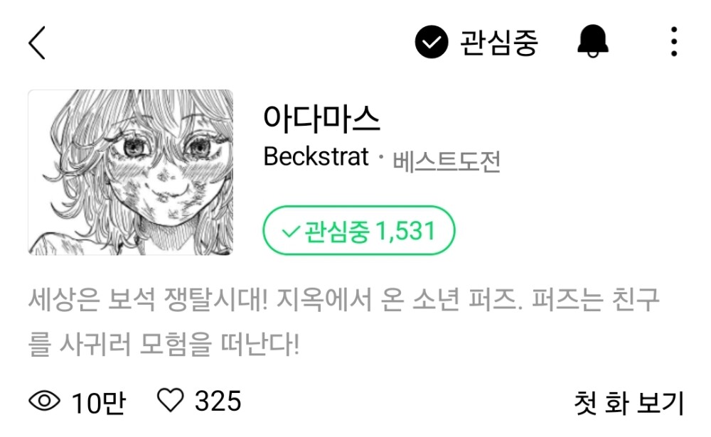 장점 1.미쳐버린퀄 지금당장 쇼년점프 잡지에 실어도 문제없는 수준의 그림임,원근법이나 표현 같은게 ㄹㅇ 좋음 2.일본만화같은 느낌 흑백으로 연재해서 애니를 책으로 보는걸 좋아한다면 한번쯤 보는걸 추천 지금은 34화까지 나왔고 3월중 휴재 복귀해서 지금 보는게 좋을듯