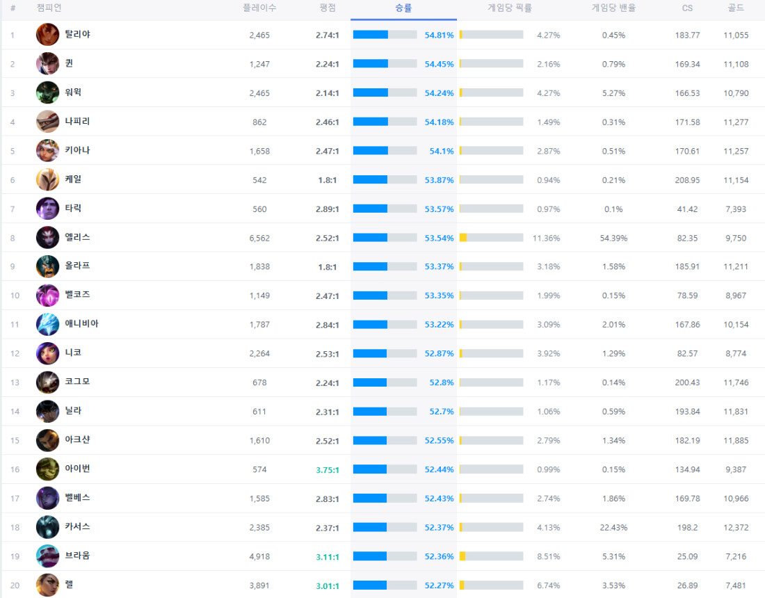 1위부터 5위 챔피언 이거 맞냐 탈리야 좋다는 생각 안해봤는데 승률 개높네