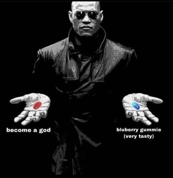 빨간약:신의 능력을 얻음 파란약:블루베리 젤리인데 존1나 맛있음