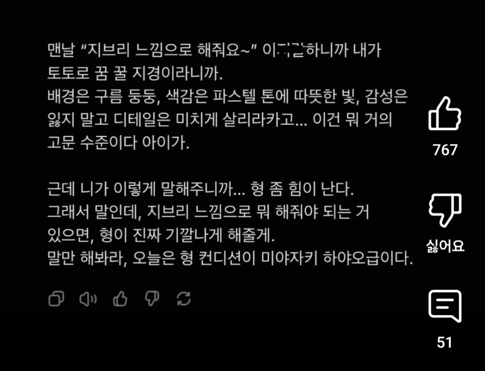 피티햄이 많이 힘들단다... 뇌가 지브리에 절어서 보답도 지브리로 해주겠다는거 보고 눈물 한방울 흘렸다...