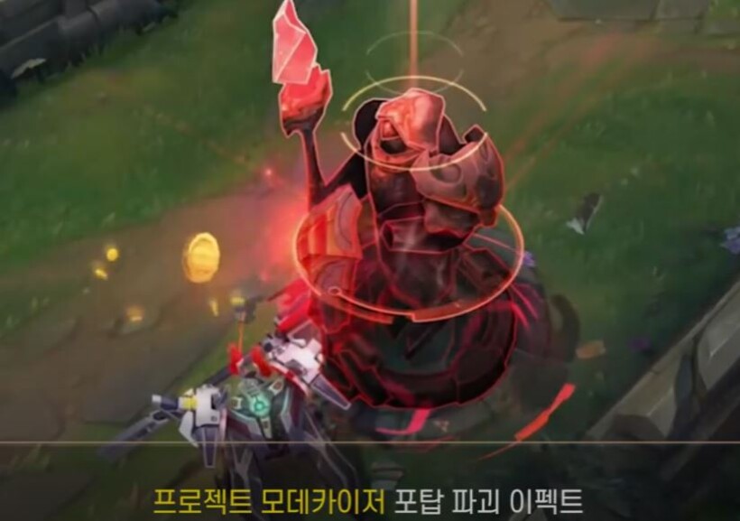 챔피언, 오브젝트 처치 이펙트 예전에 2400rp의 스킨이 출시된다는 떡밥이 돌 때 개발자가 맛보기로 올린 이펙트들 프젝모데가 포탑 파괴 시 포탑이 홀로그램으로 변해 소멸하고 폭풍용 리신이 적챔을 처치하면 체력바에 폭풍용 마크가 생겼다가 체력바와 함께 파괴됨