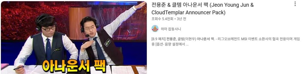 전용 아나운서 히오스나 이터널리턴은 특정 캐릭터의 아나운서를 따로 판매함 롤도 이벤트 마다 아나운서가 바뀌긴 했는데(아우솔, 갱플랭크, 아케인챔피언들, 별수호자 아리, 오디세이 케인, 클템 전용준)