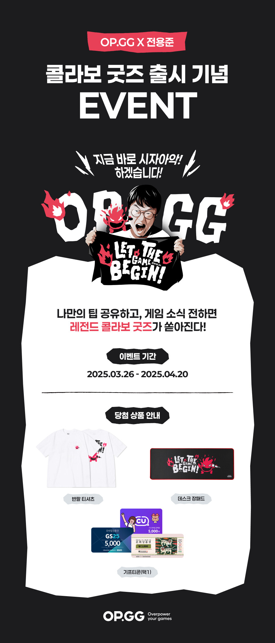 OP.GG x 전용준 캐스터의 레전드 콜라보 굿즈🎁와 기프티콘🎫의 주인공이 누군지, 지금 바로 확인해 보세요!