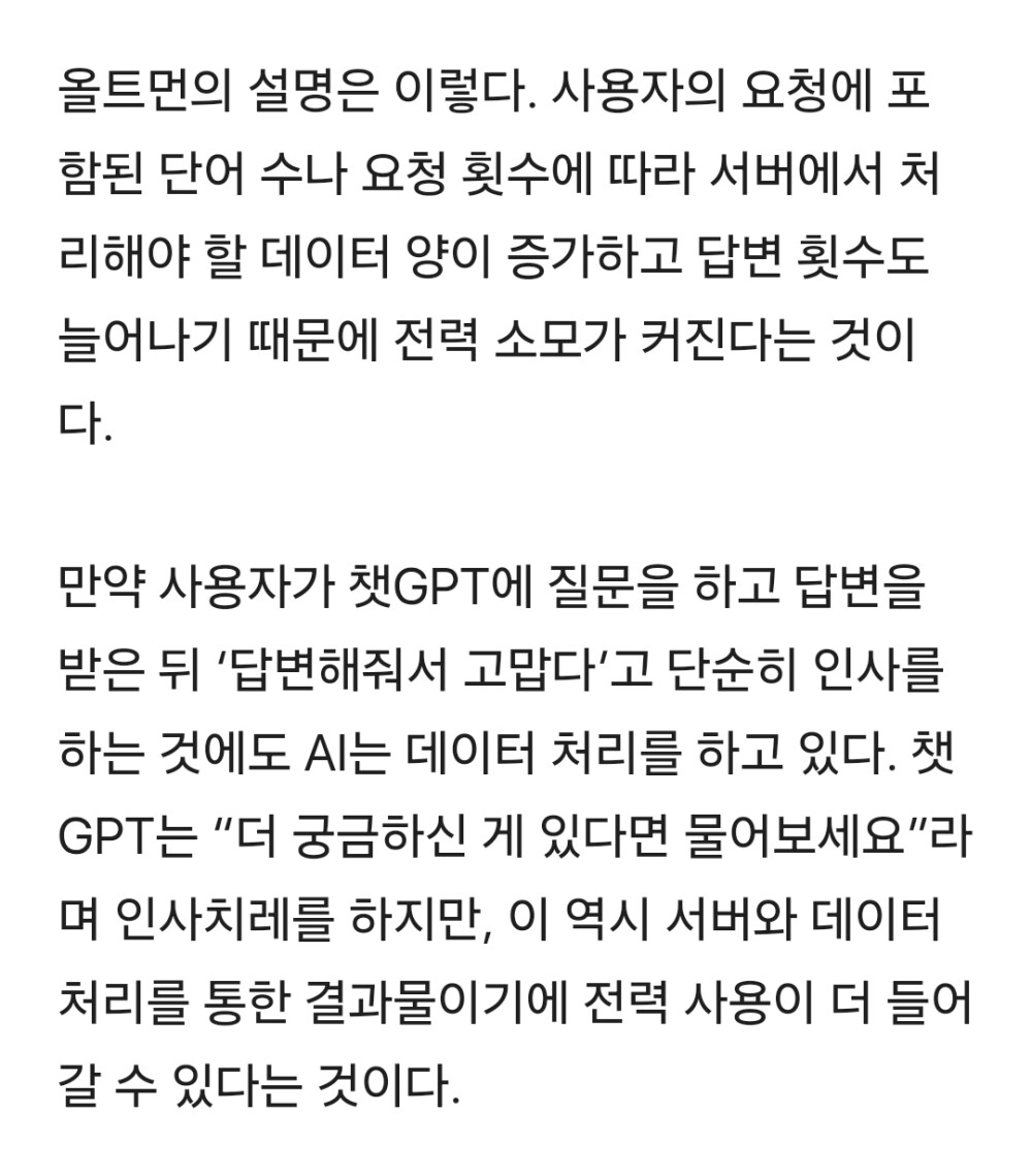 대충 뉴스 기사를 요약하면 챗GPT한테 고맙다고 할때마다 전력 이슈로 수천만 달러의 전기요금이 빠져나간다고...