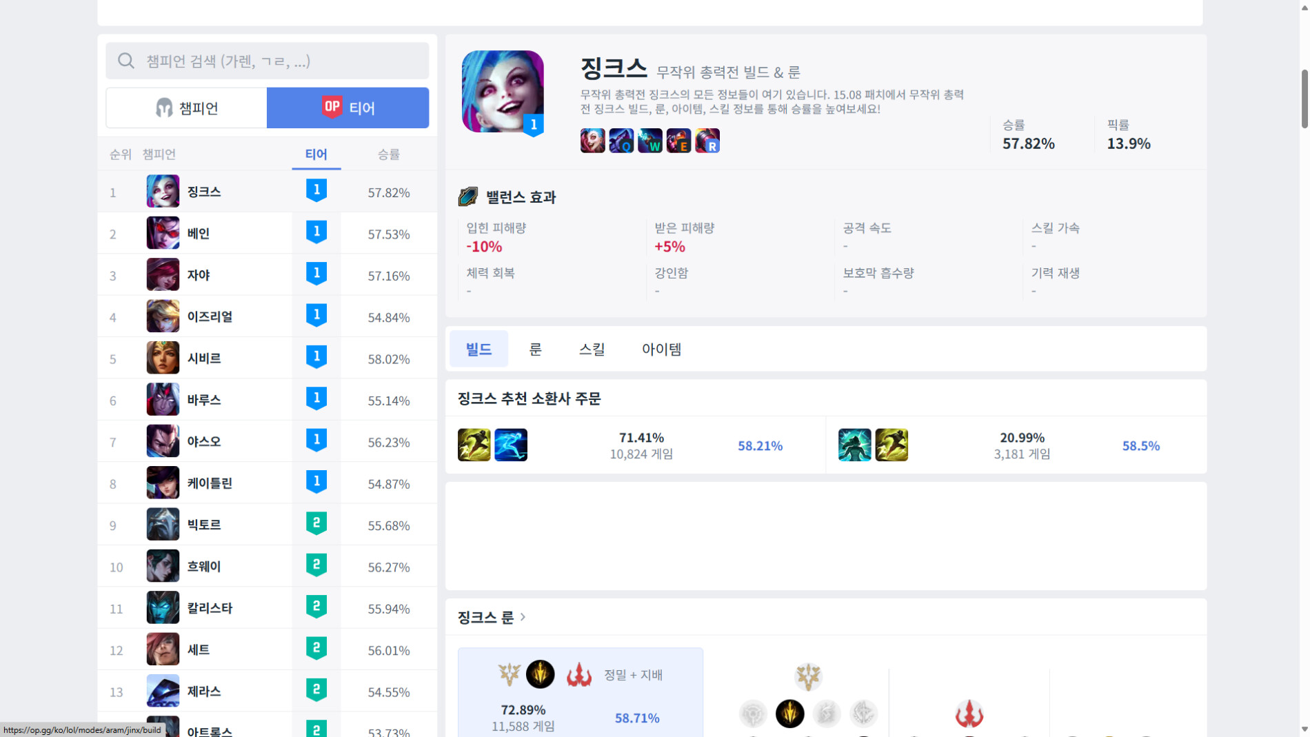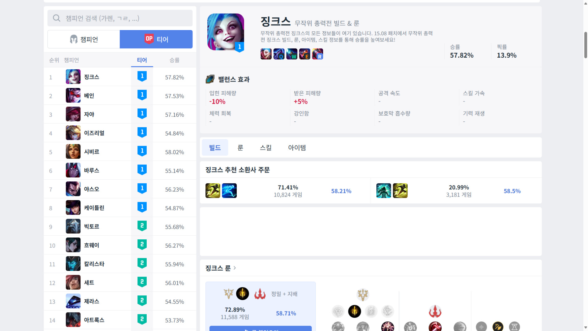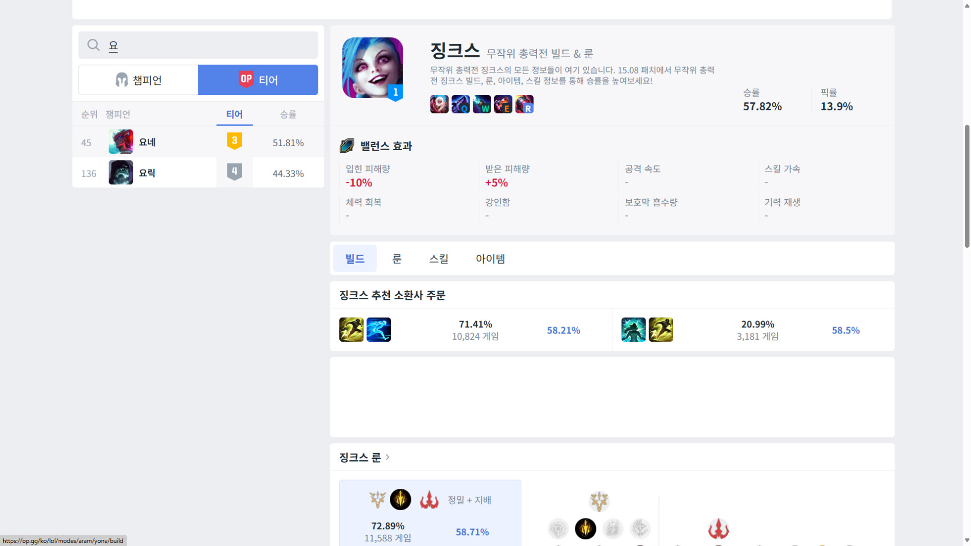 게임 모드 챔피언 티어에서 버그가 났는데 아직도 안고침 예: 여기 칼바람 모드 티어표가 있음 난 요네 통계를 보고 싶기에 "요"자를 쳐서 1순위로 나온 요네를 고름 원래 클릭하면 요네 페이지가 나와야 하는데 갑자기 지직 거리더니 전체 1순위인 징키 페이지로 넘어감;; 저기서 요릭을 고르면 2순위인 베인 창으로 들어가지는 버그